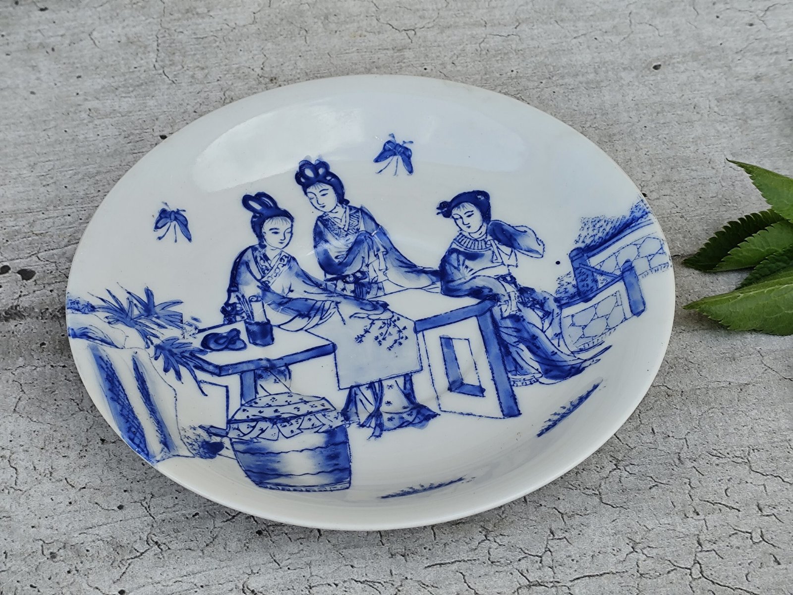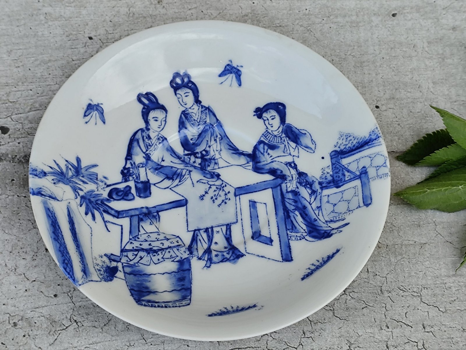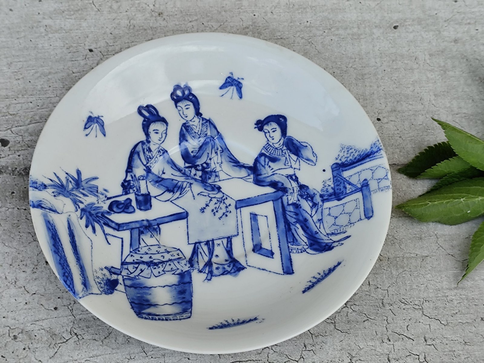 Une assiette en porcelaine délicatement décorée d’une scène traditionnelle chinoise, peinte au cobalt bleu sur fond blanc. Trois personnages se retrouvent autour d’une table, dans un jardin paisible où plantes, architecture et gestes racontent un moment suspendu.