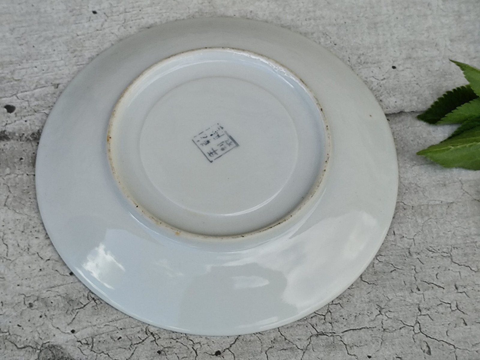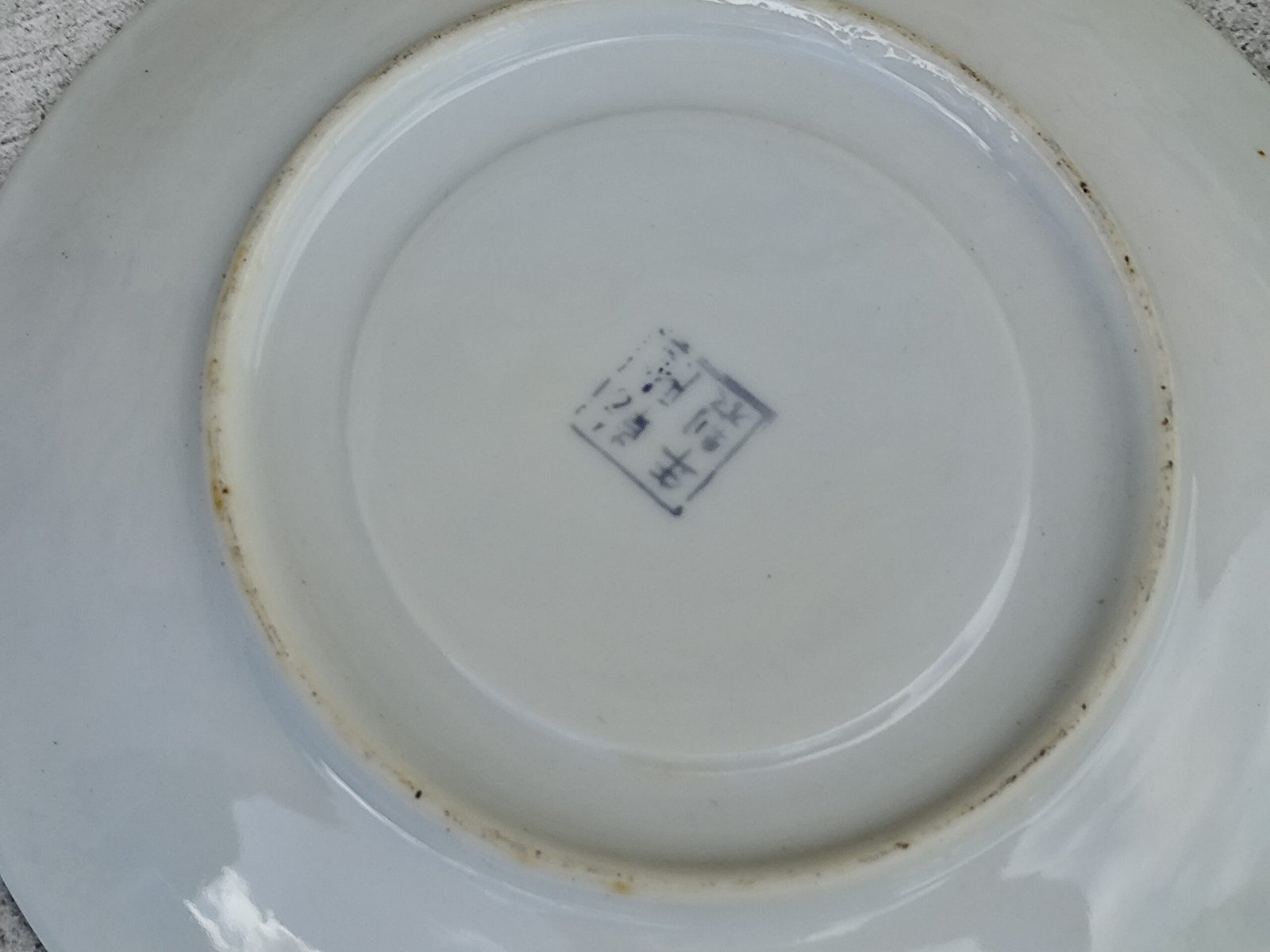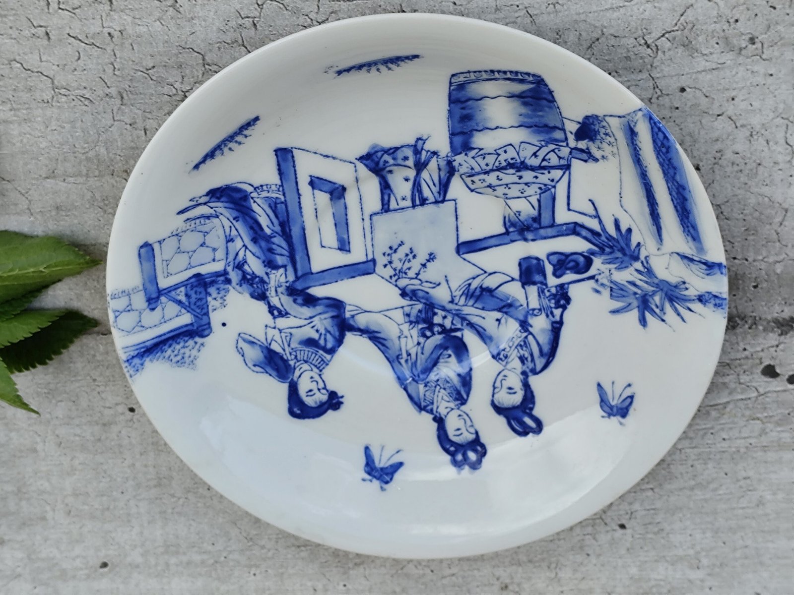 Une assiette en porcelaine délicatement décorée d’une scène traditionnelle chinoise, peinte au cobalt bleu sur fond blanc. Trois personnages se retrouvent autour d’une table, dans un jardin paisible où plantes, architecture et gestes racontent un moment suspendu.