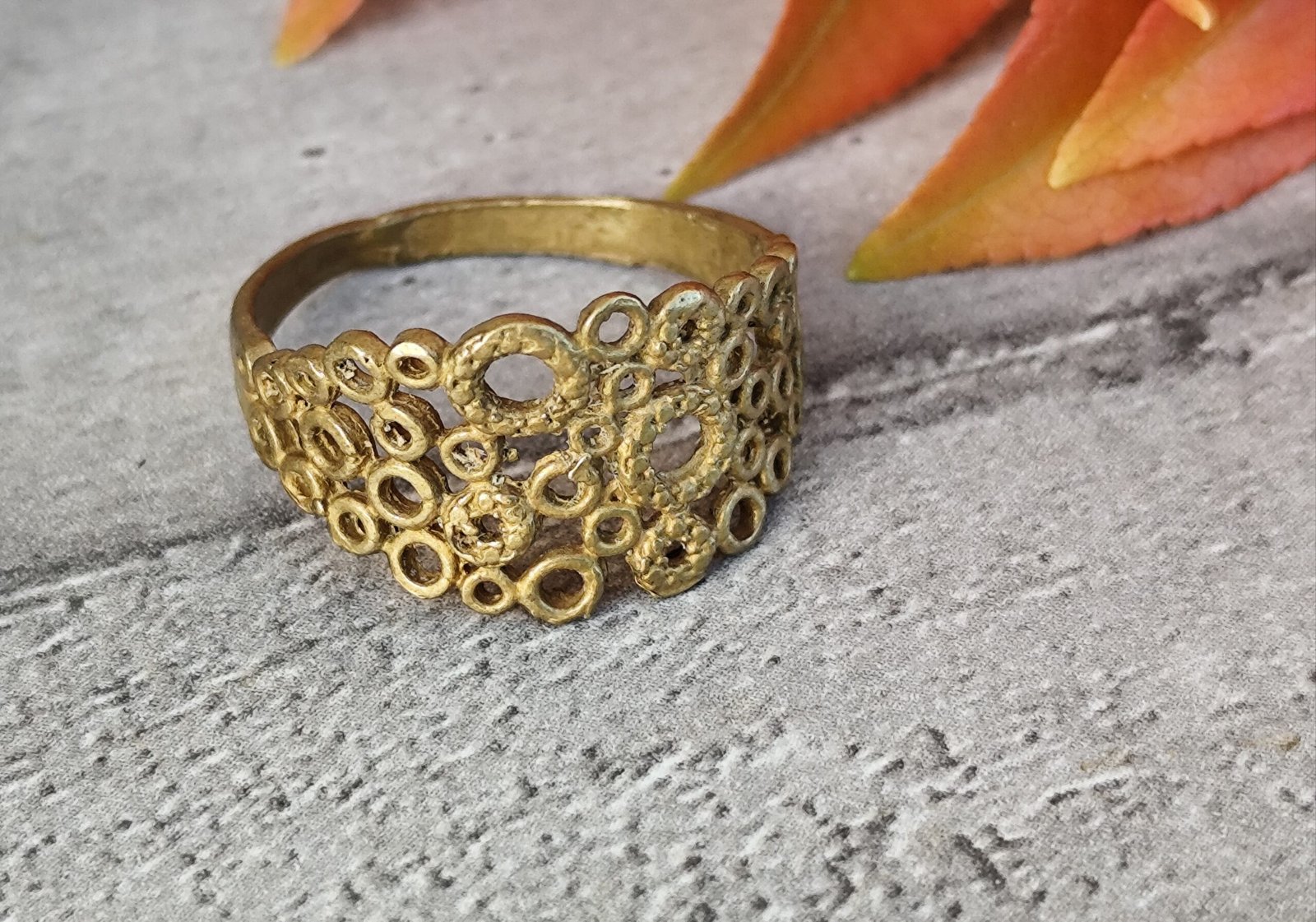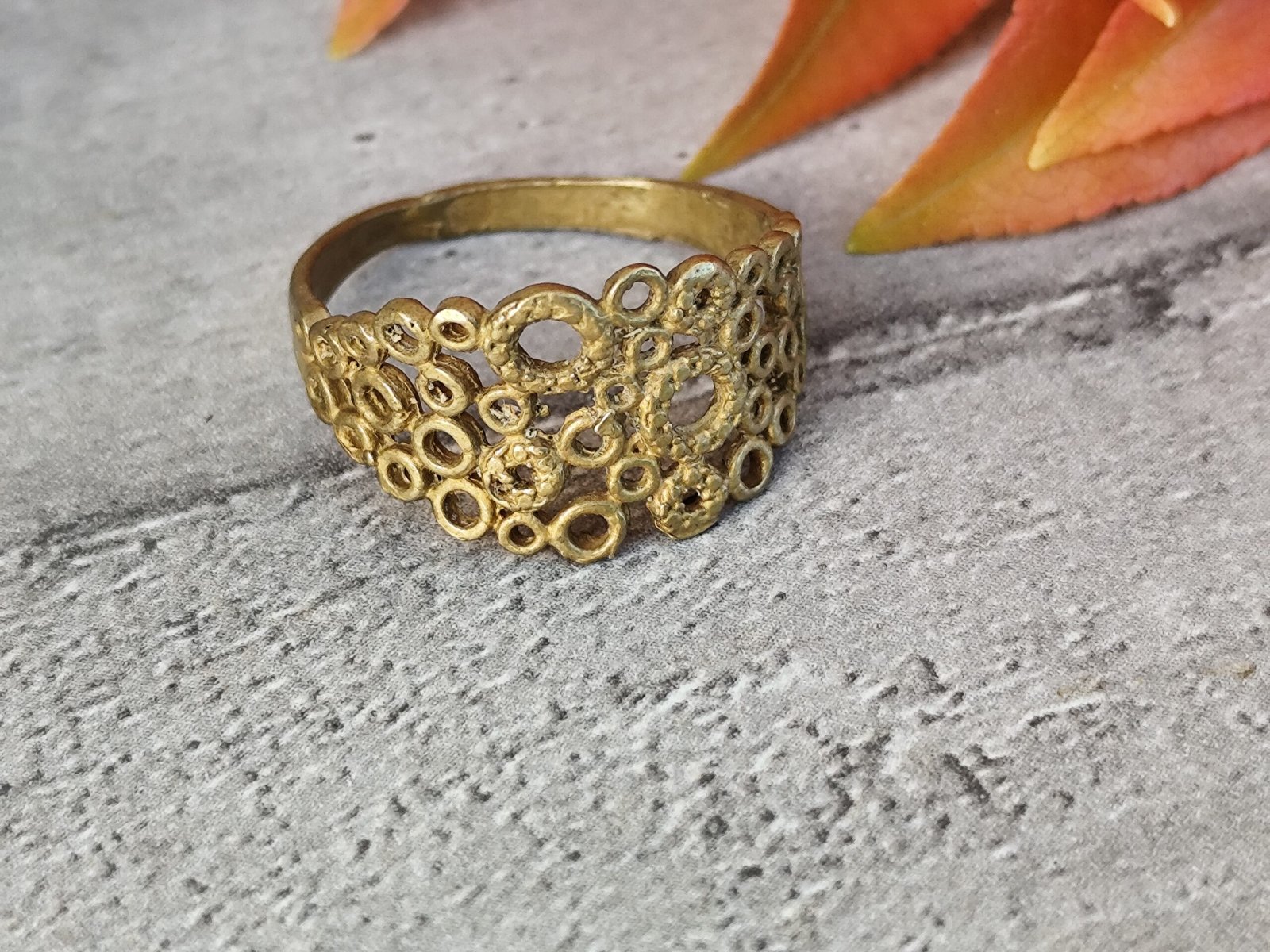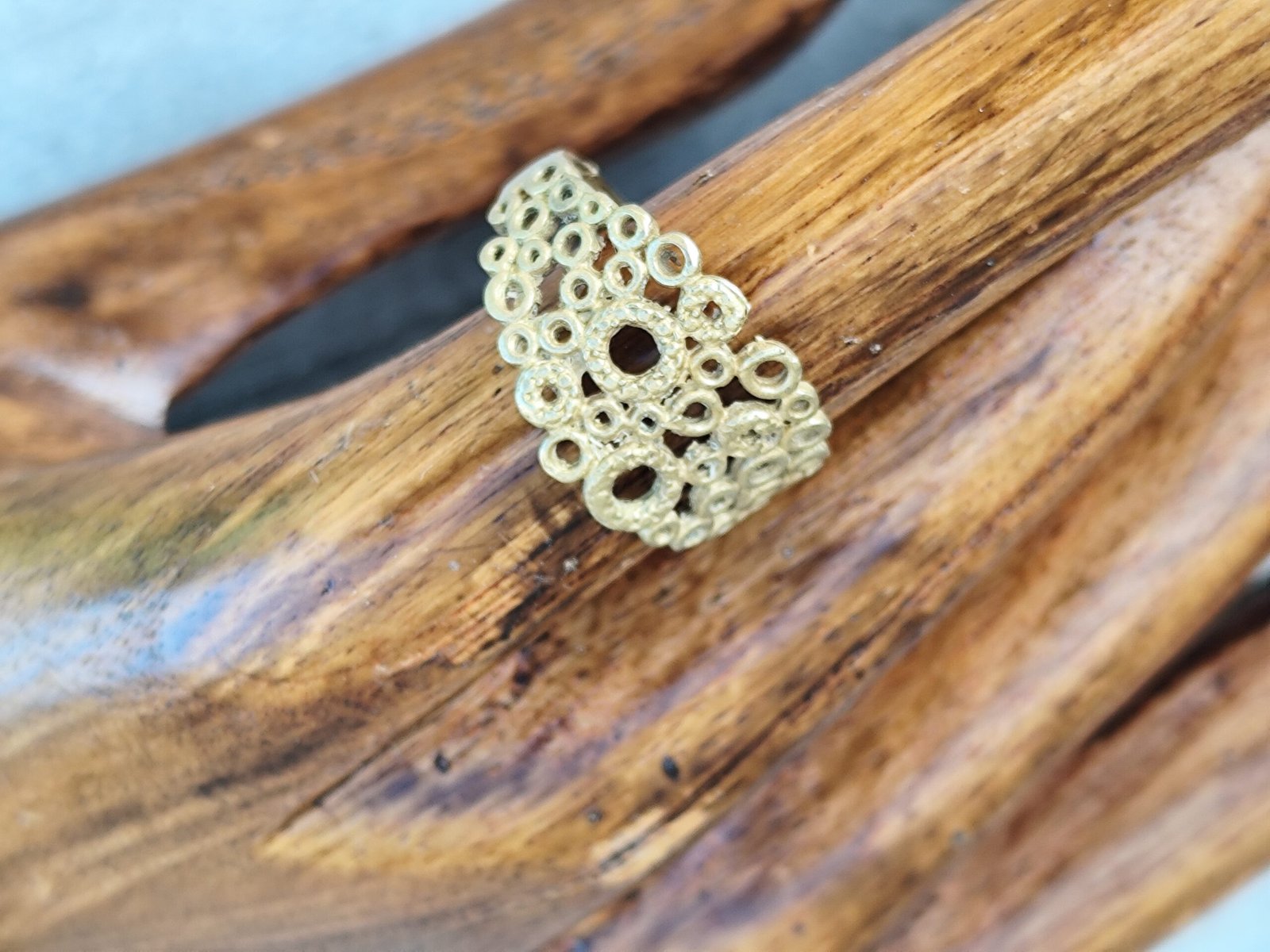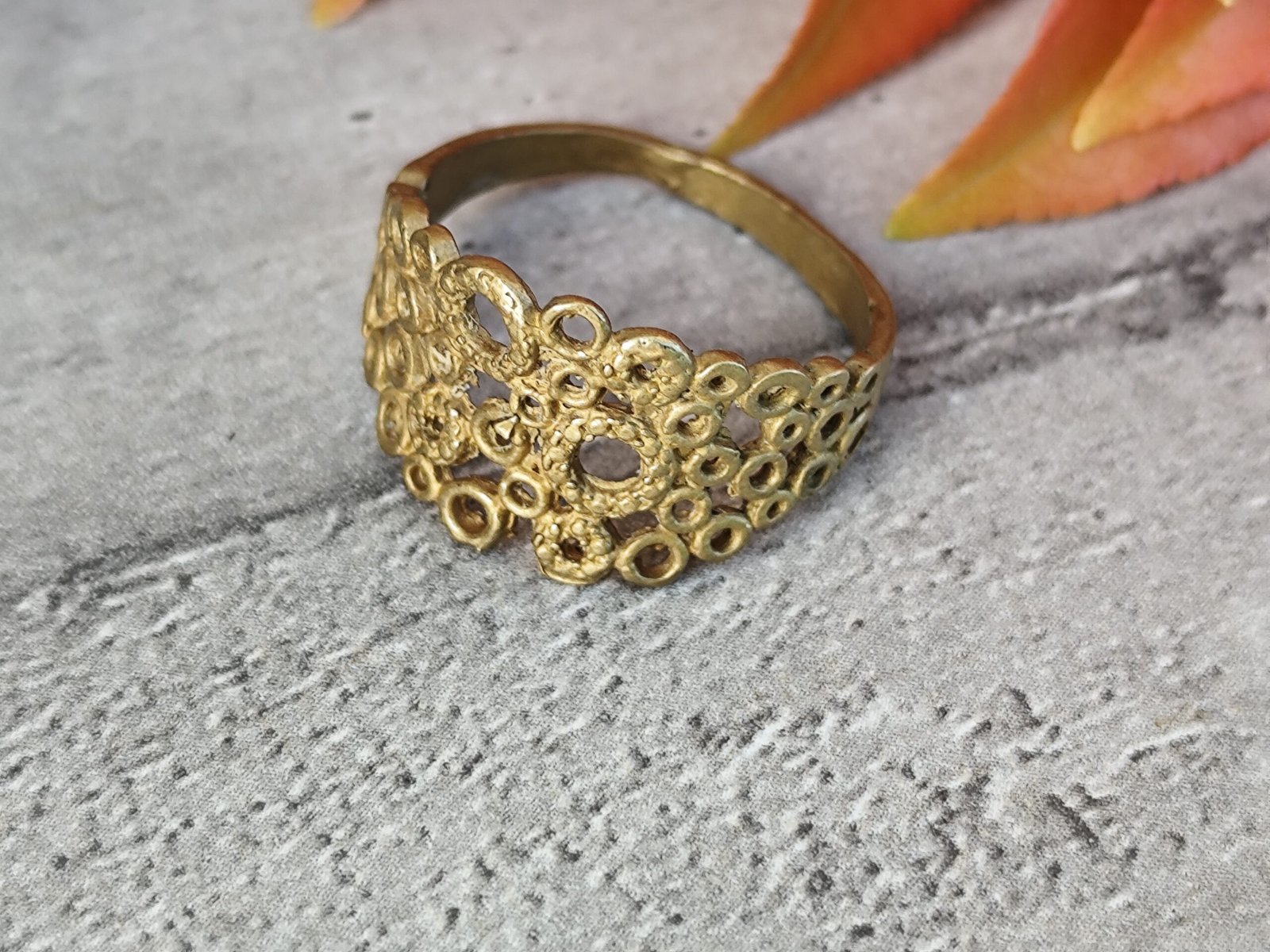Une bague marocaine façonnée en laiton artisanal, dont le motif ajouré rappelle la dentelle solaire des bijoux berbères.