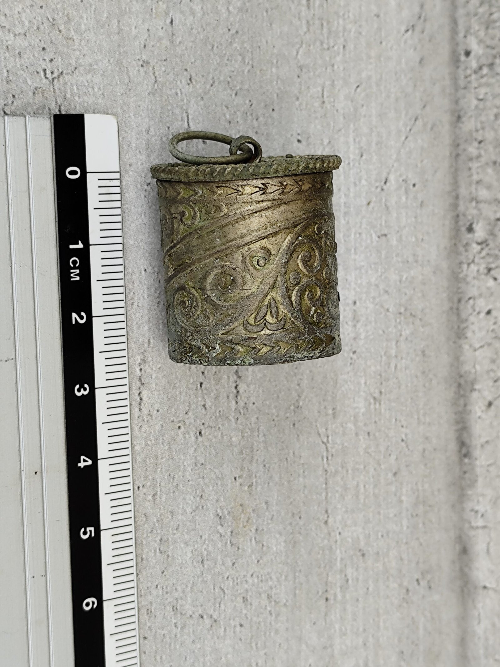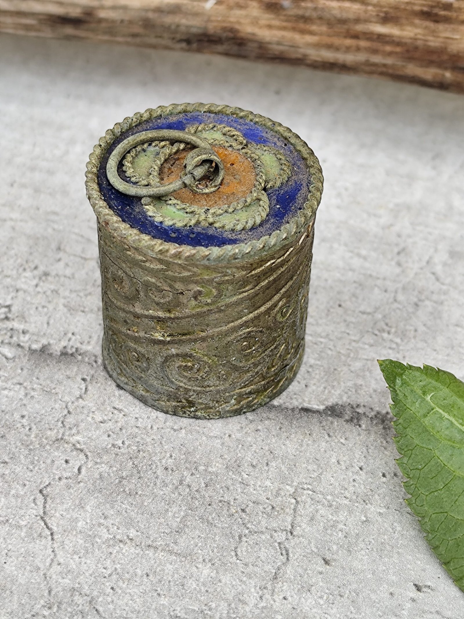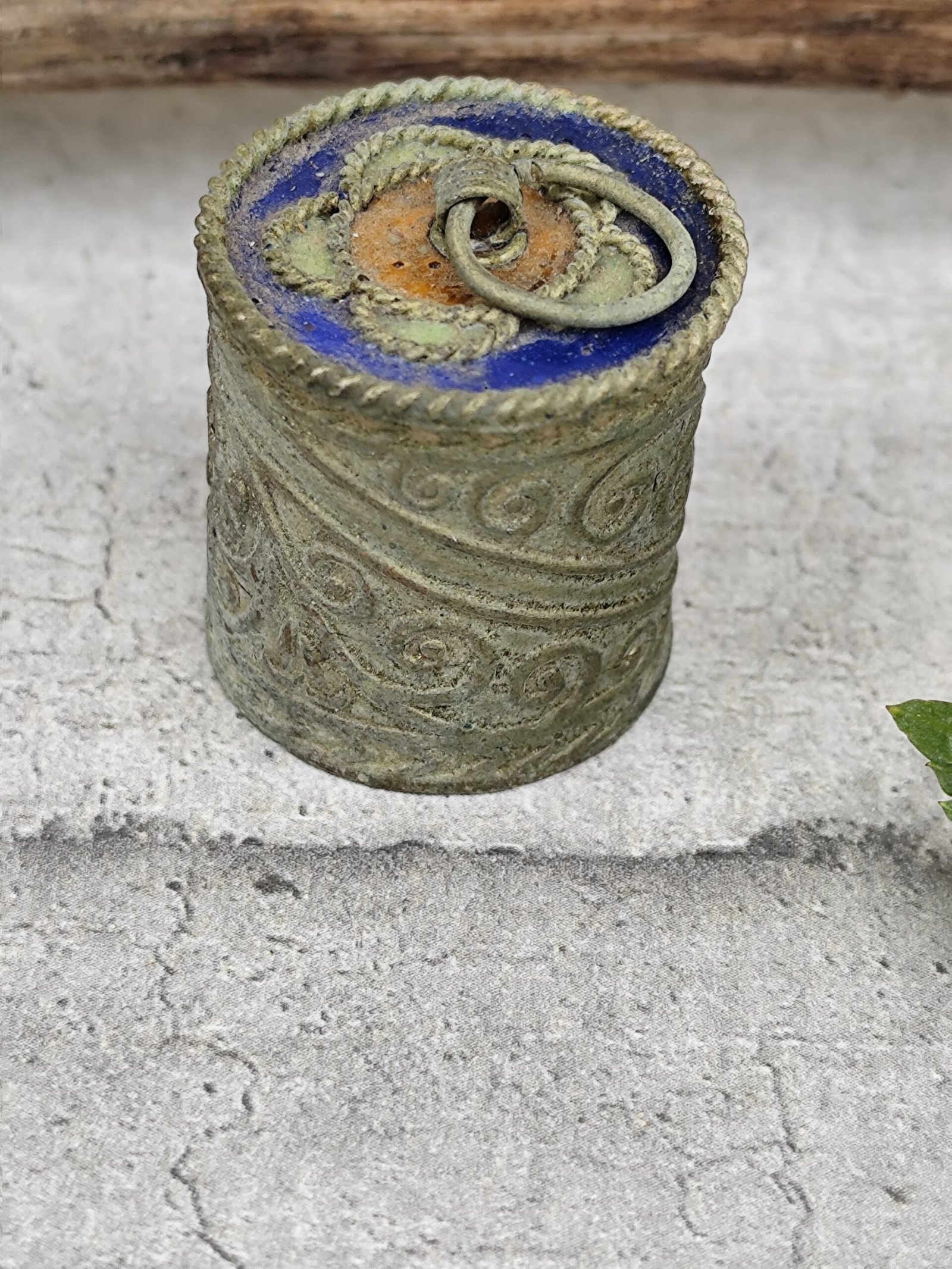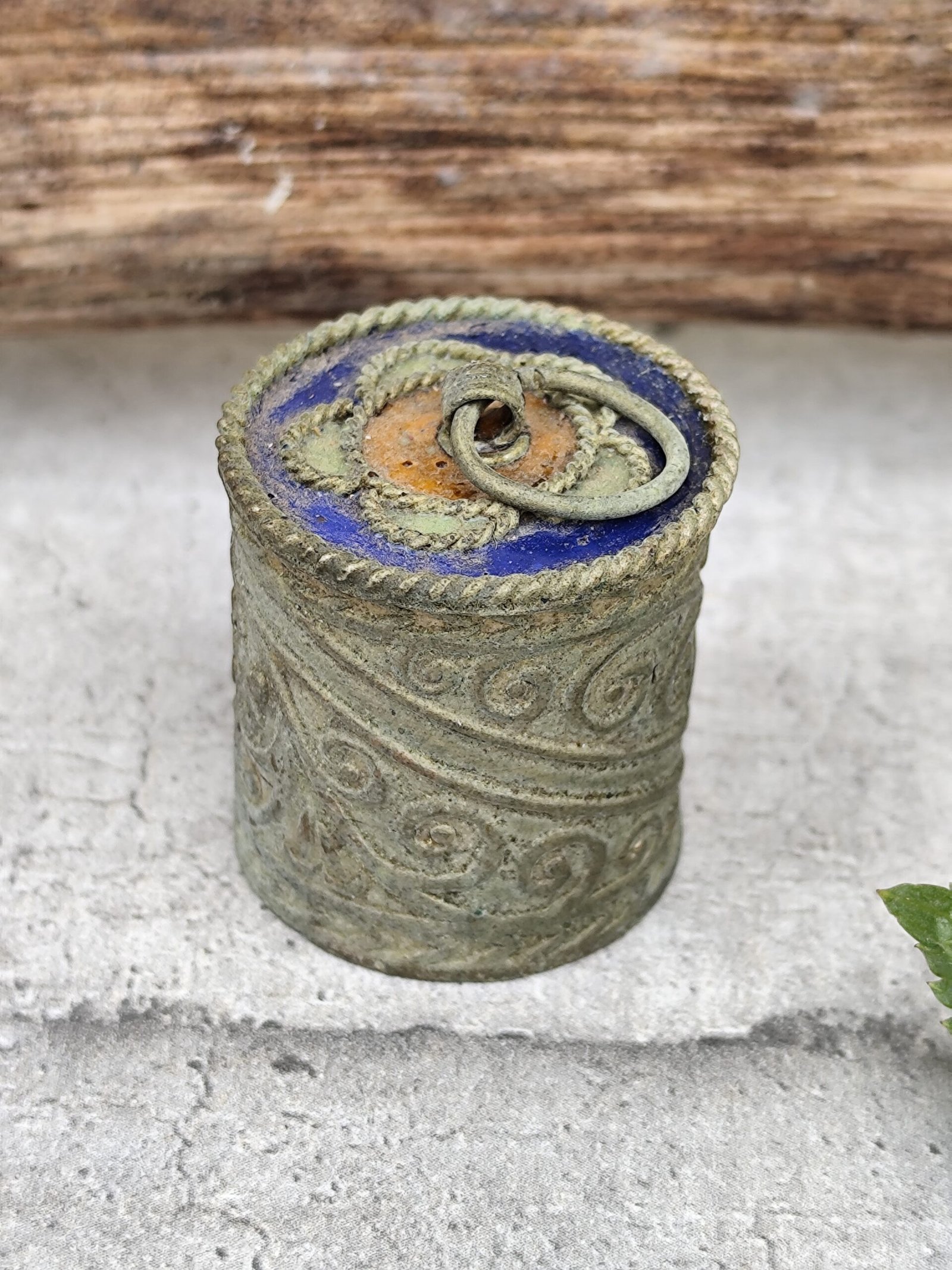 Façonnée dans un métal patiné par le temps, cette boîte marocaine révèle un décor de spirales et de motifs ciselés à la main. Son couvercle orné d’un anneau traditionnel et d’émaux colorés lui confère une présence rare, presque rituelle. Objet de mémoire, de voyage et de savoir‑faire, elle apporte à votre intérieur une touche d’authenticité, de mystère et de poésie orientale.
