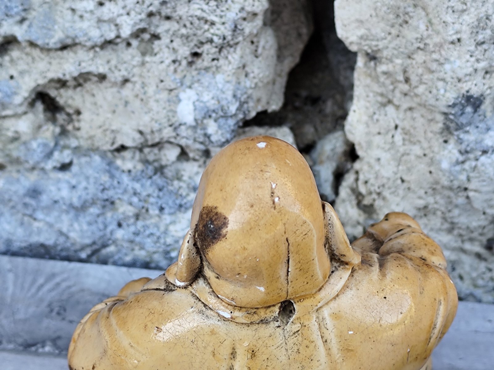 Petite statue ancienne du Bouddha Rieur, figure emblématique de joie, d’abondance et de protection bienveillante. Pièce en matière patinée en plâtre au craquelé naturel, offrant un charme wabi‑sabi et une présence chaleureuse. Idéale pour un coin méditation, une étagère zen ou une ambiance voyage.