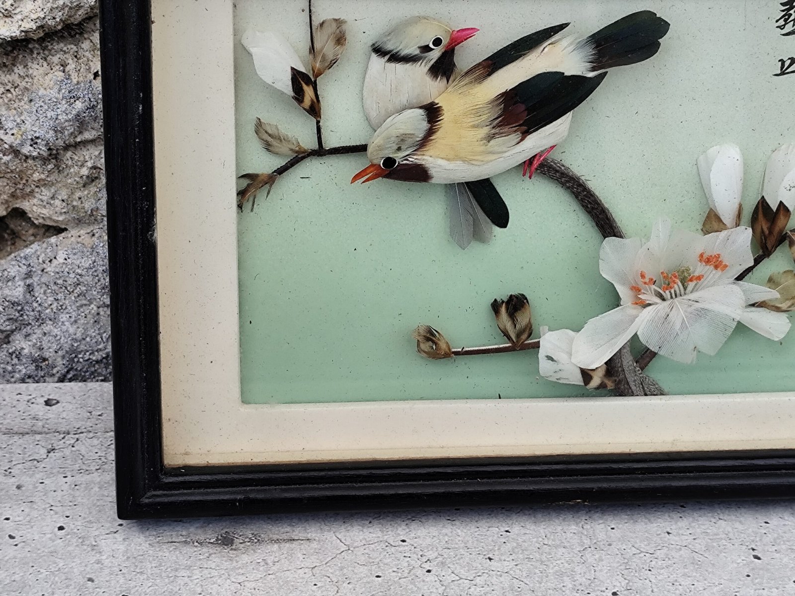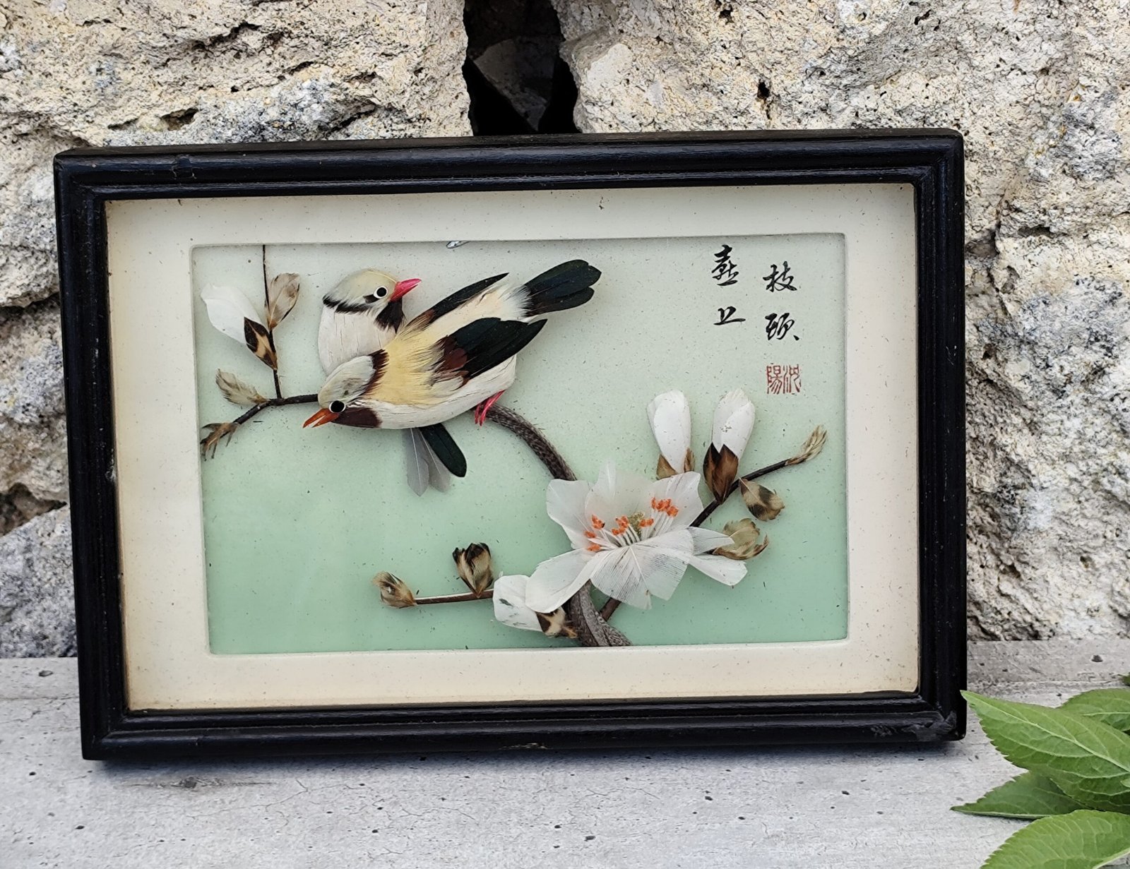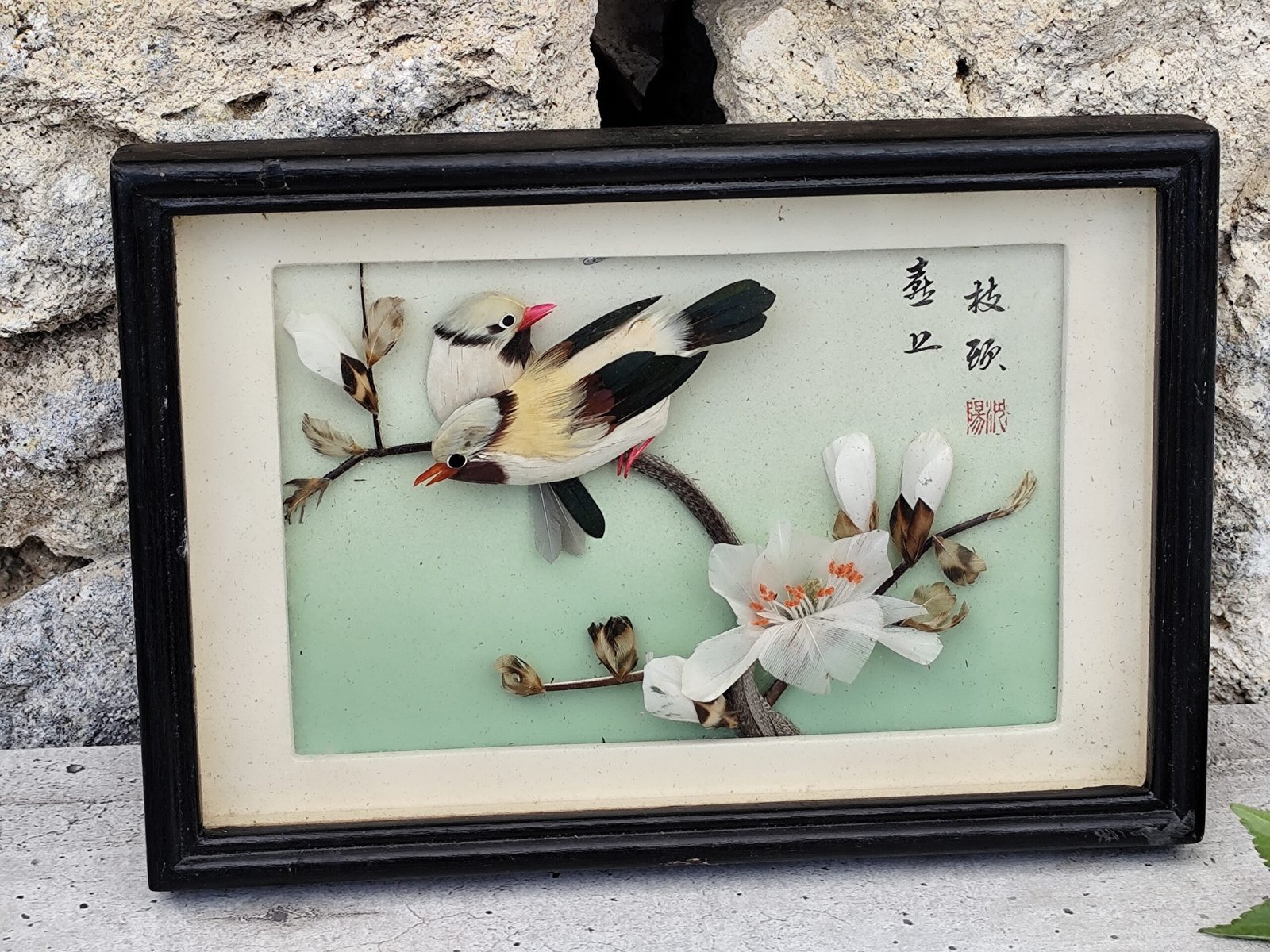 Cadre diorama chinois – Oiseaux en plumes & fleurs – Art décoratif traditionnel.