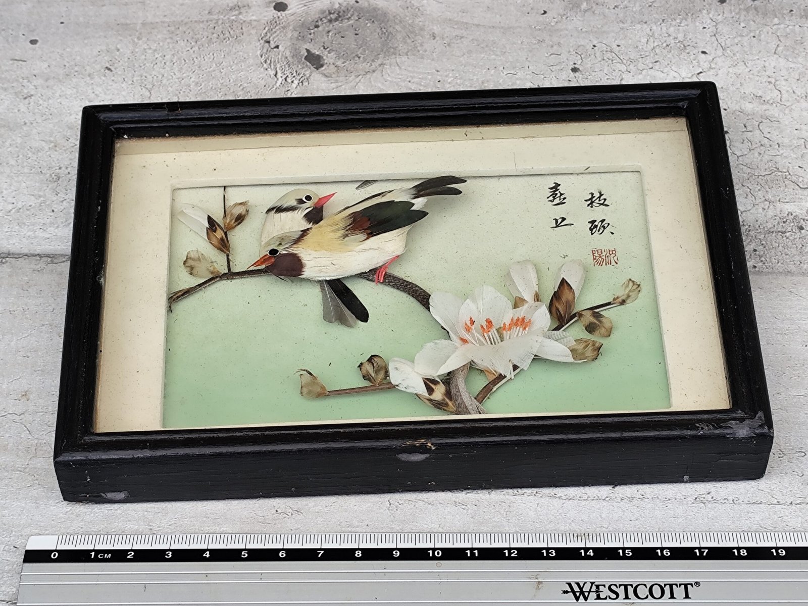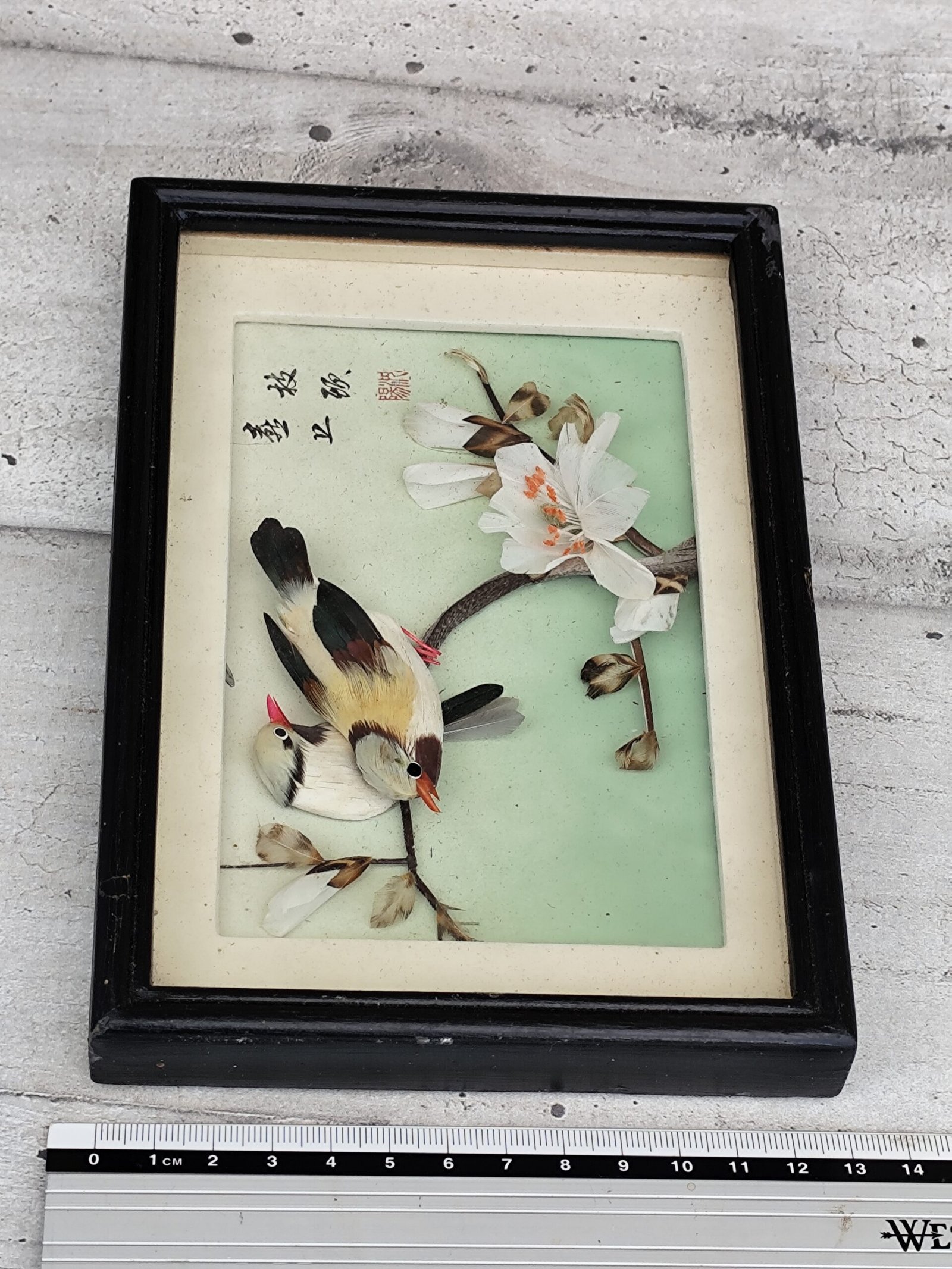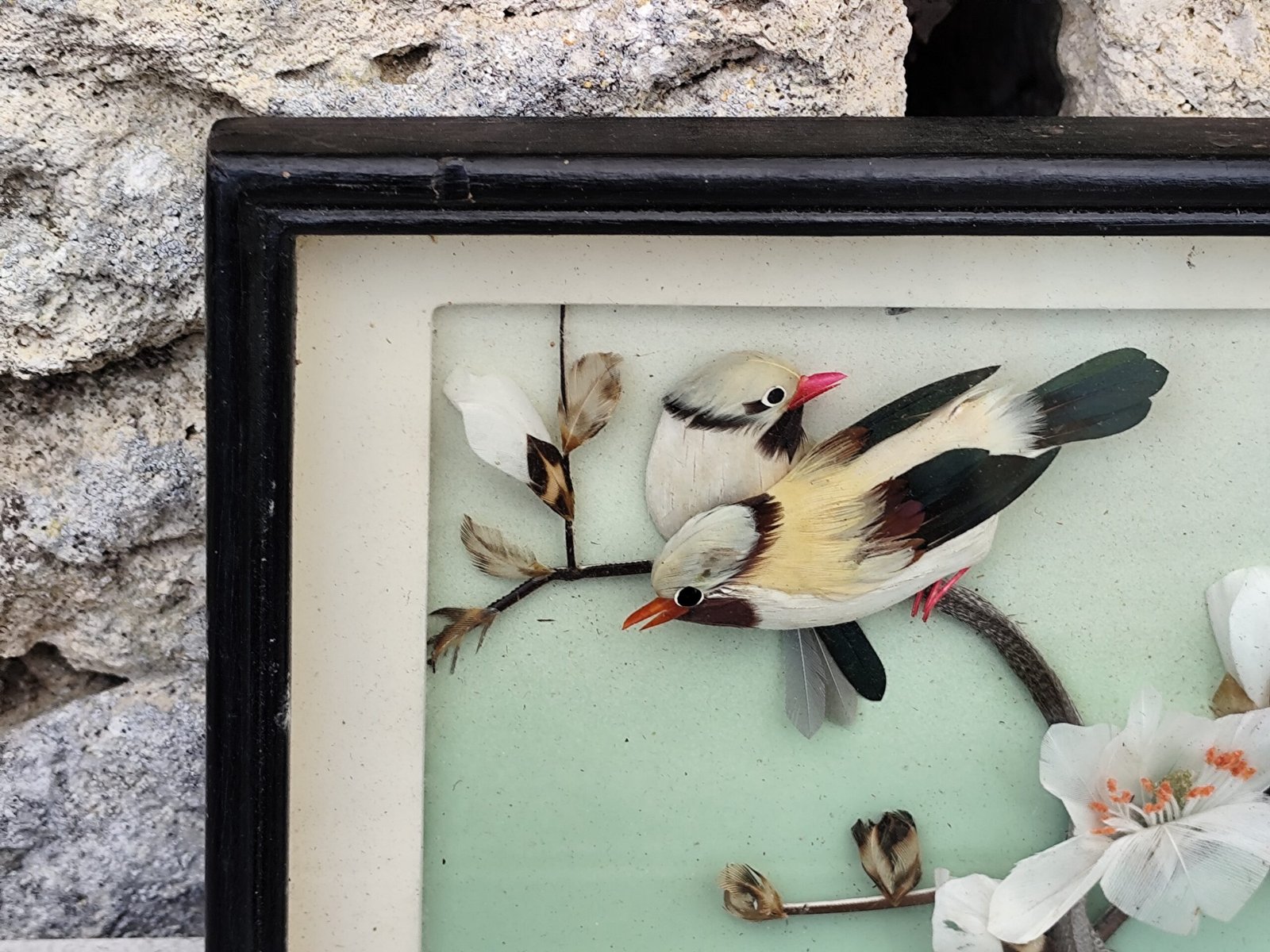 Cadre diorama chinois – Oiseaux en plumes & fleurs – Art décoratif traditionnel.