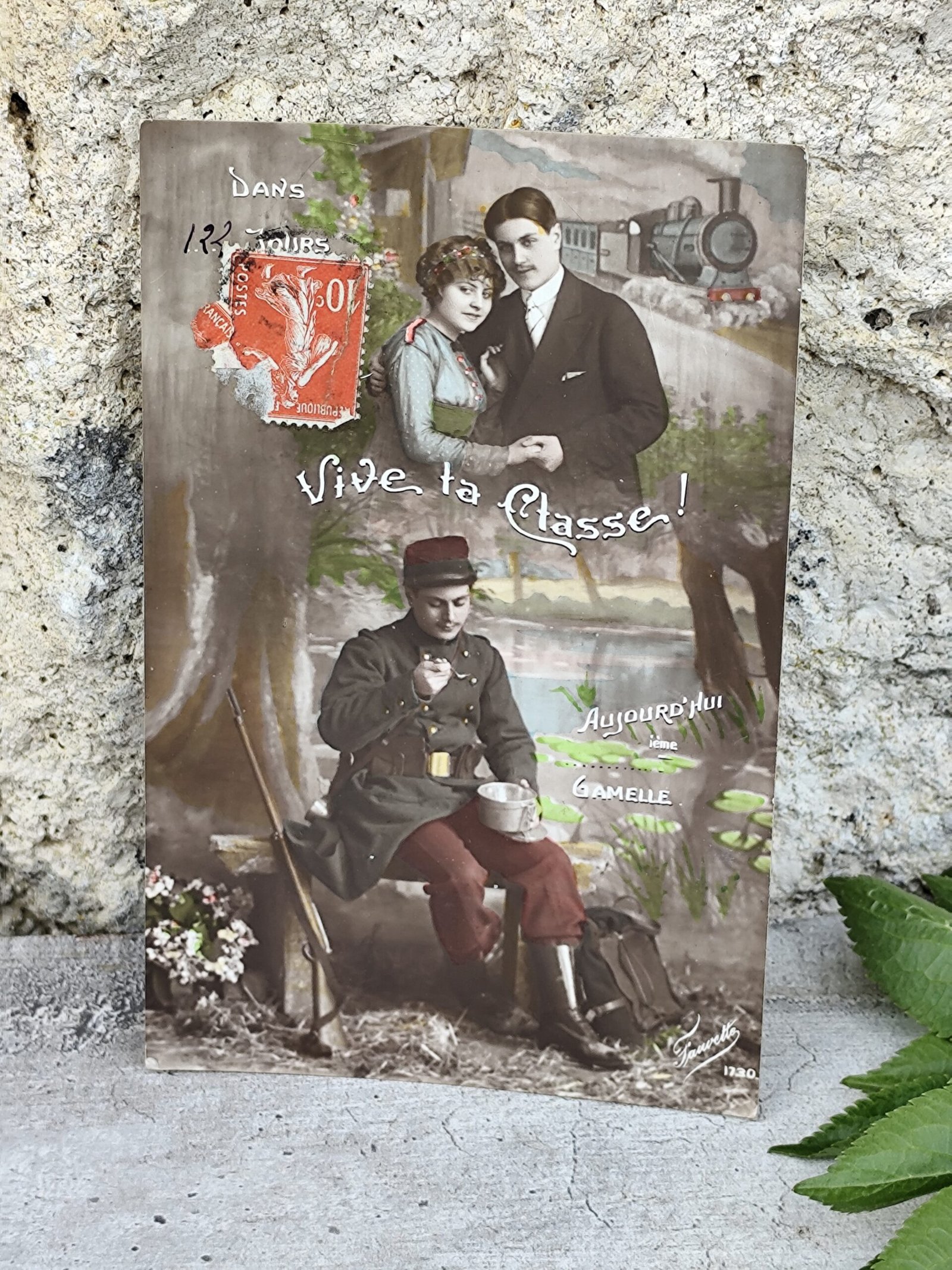 Carte postale ancienne – Scènes militaires et départ en train (début XXᵉ).