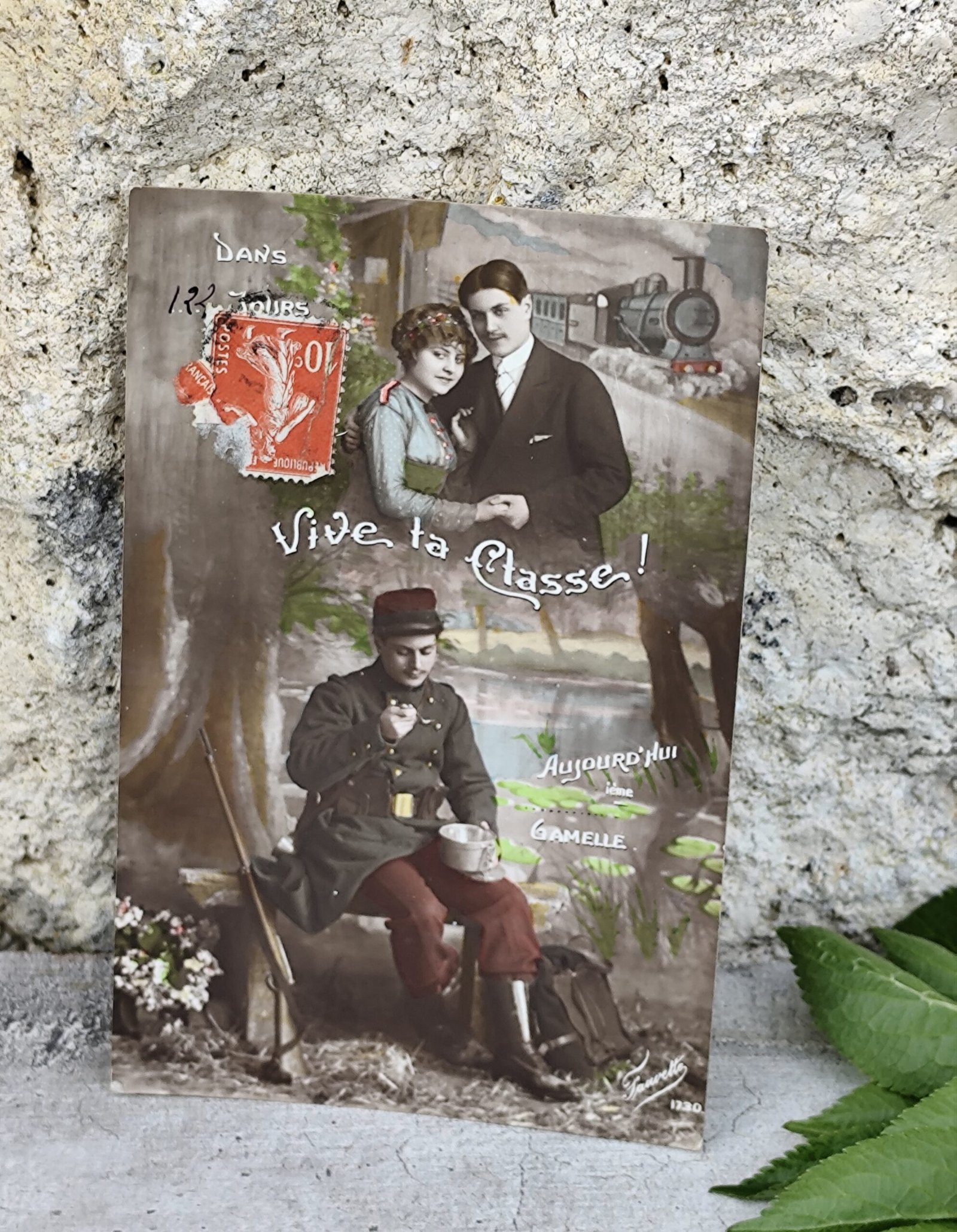 En bas, un soldat mange sa gamelle, assis dans la terre, son fusil posé à ses côtés. Entre les deux scènes, toute la tension d’une époque où l’on quittait ceux qu’on aimait pour servir plus loin.