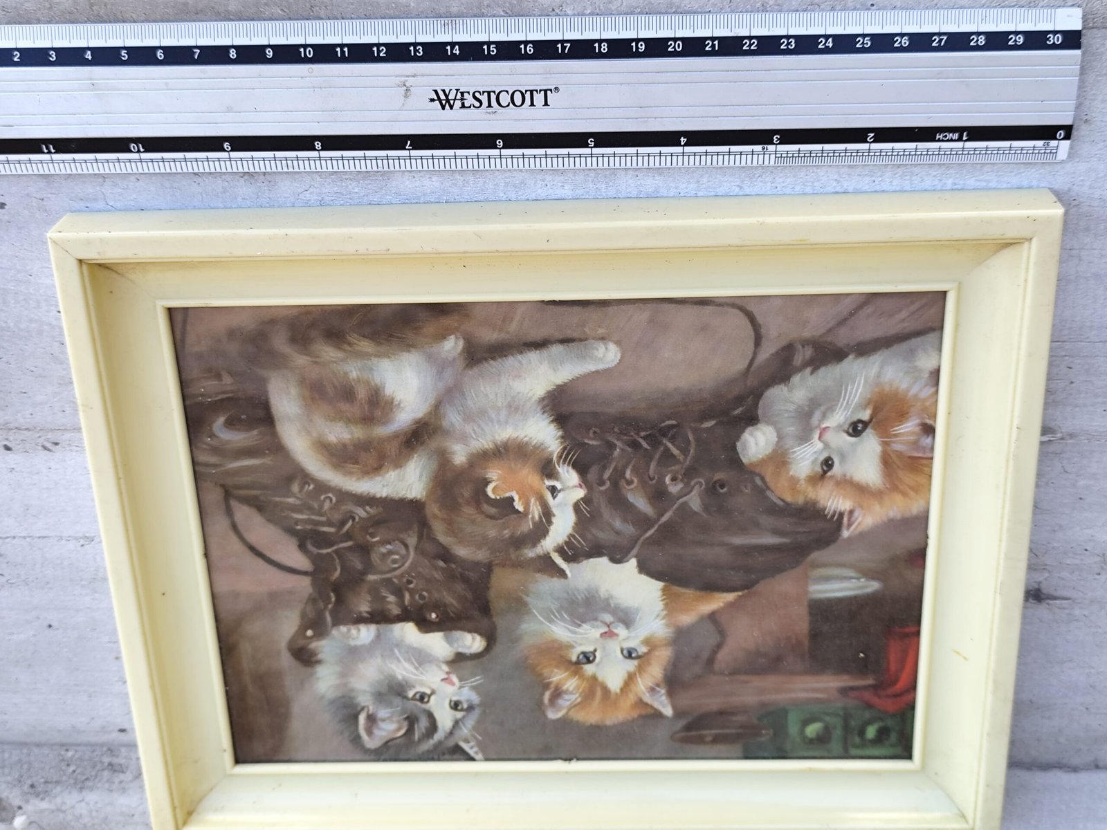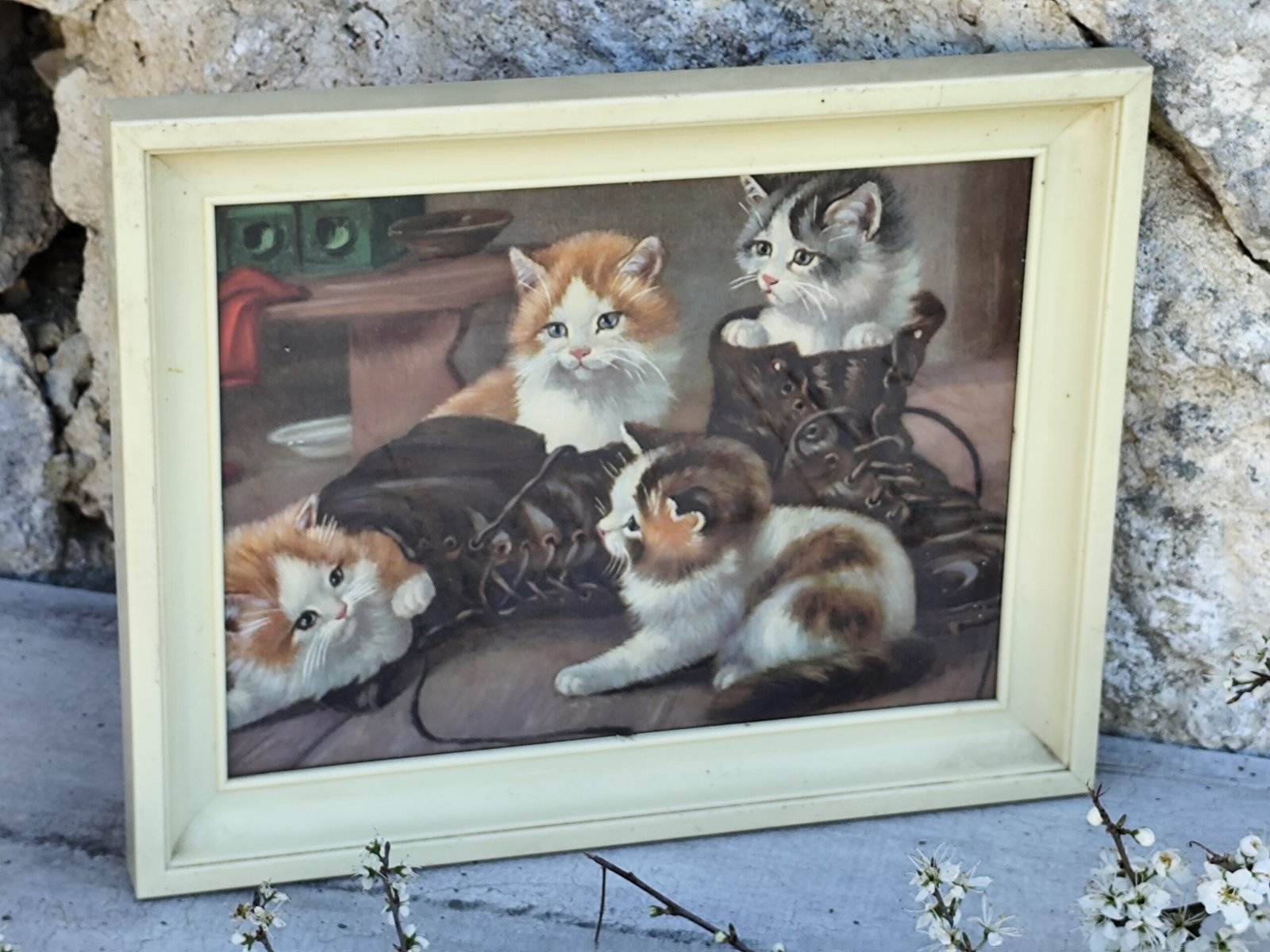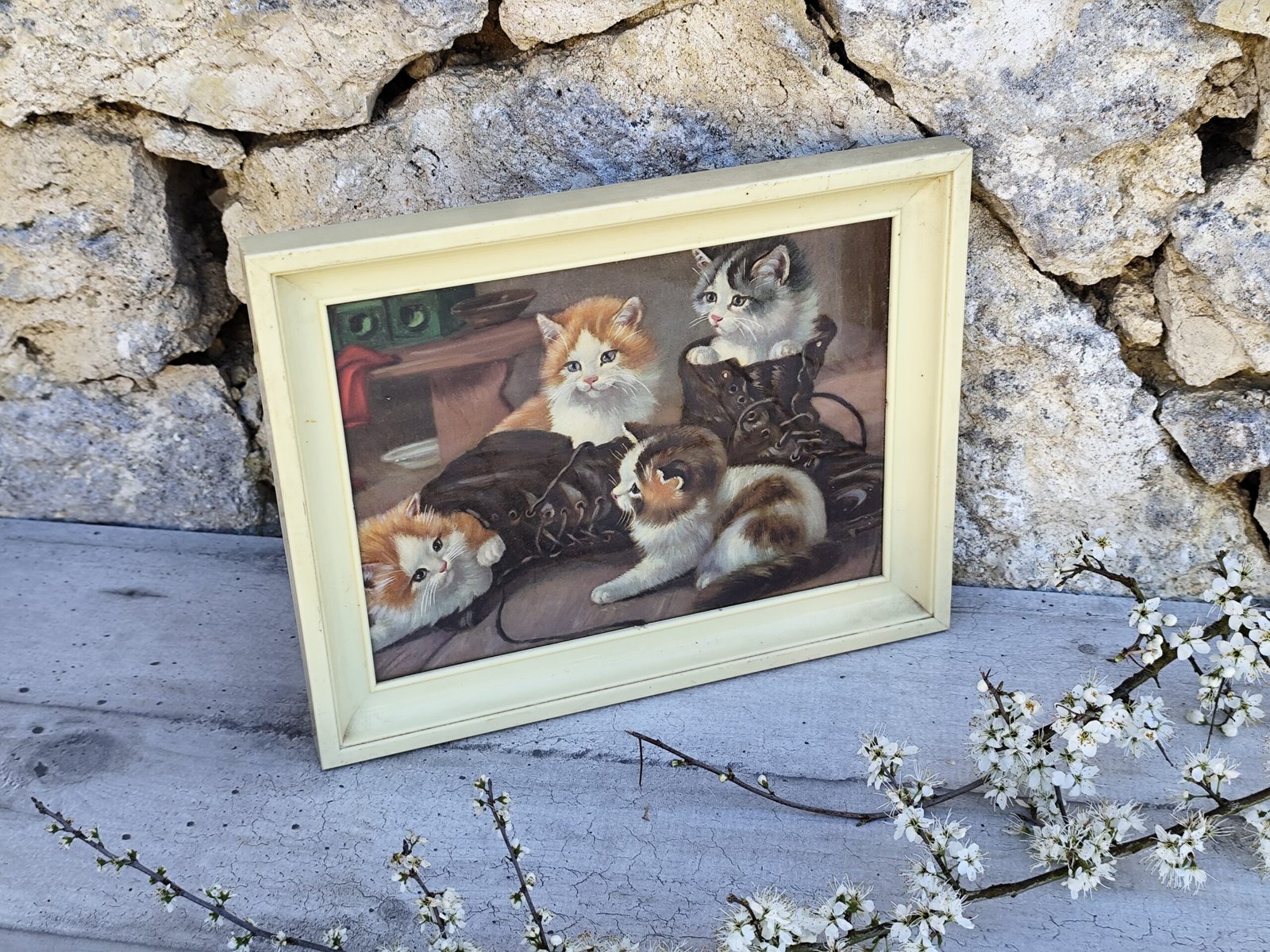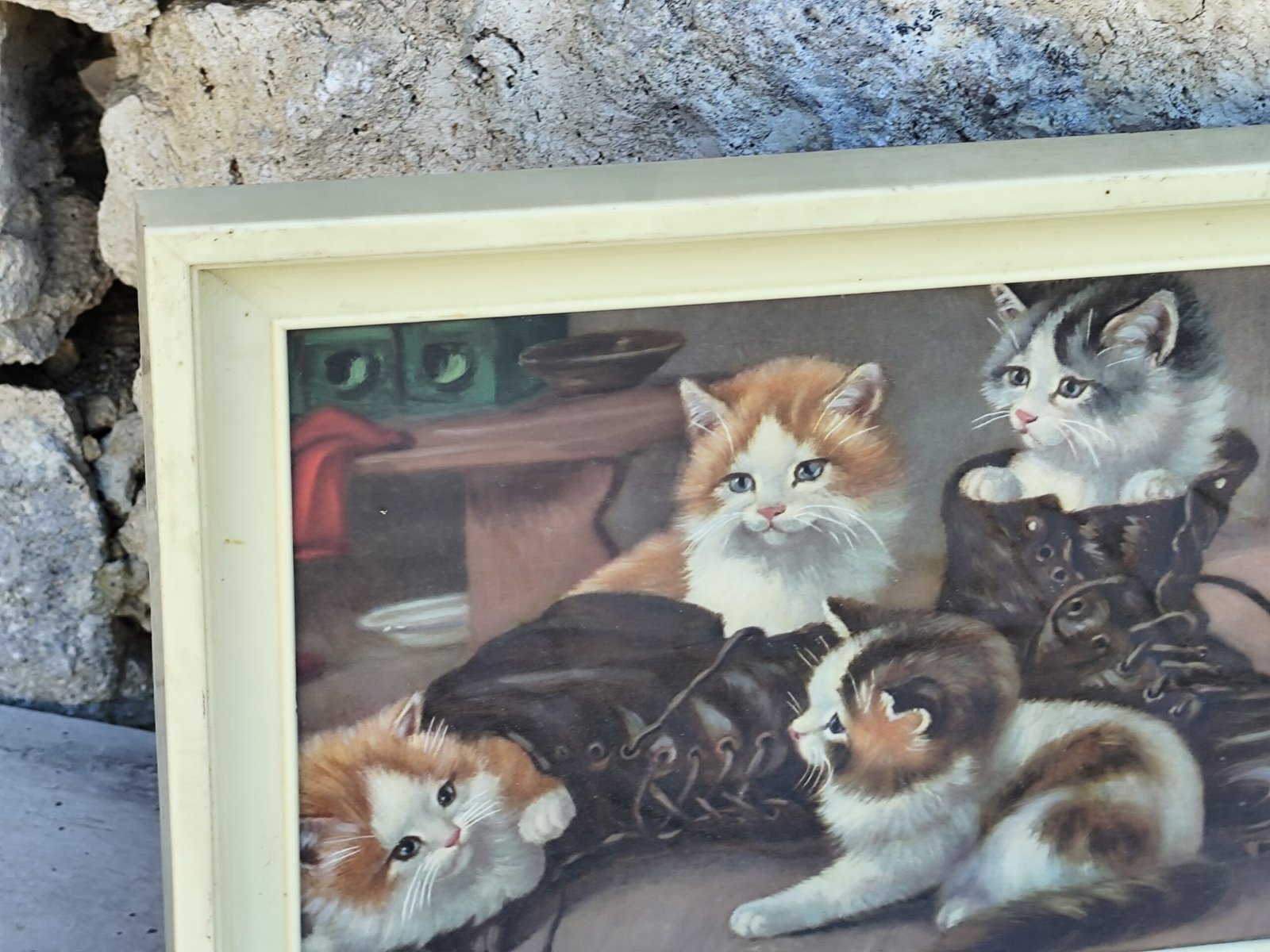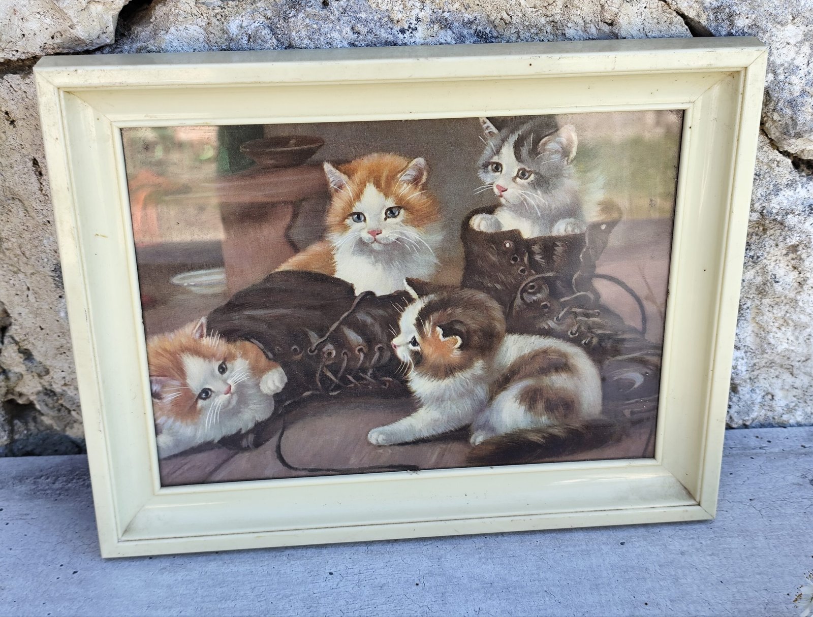 Chromo ancien de chats – Illustration rétro dans cadre en bakélite.