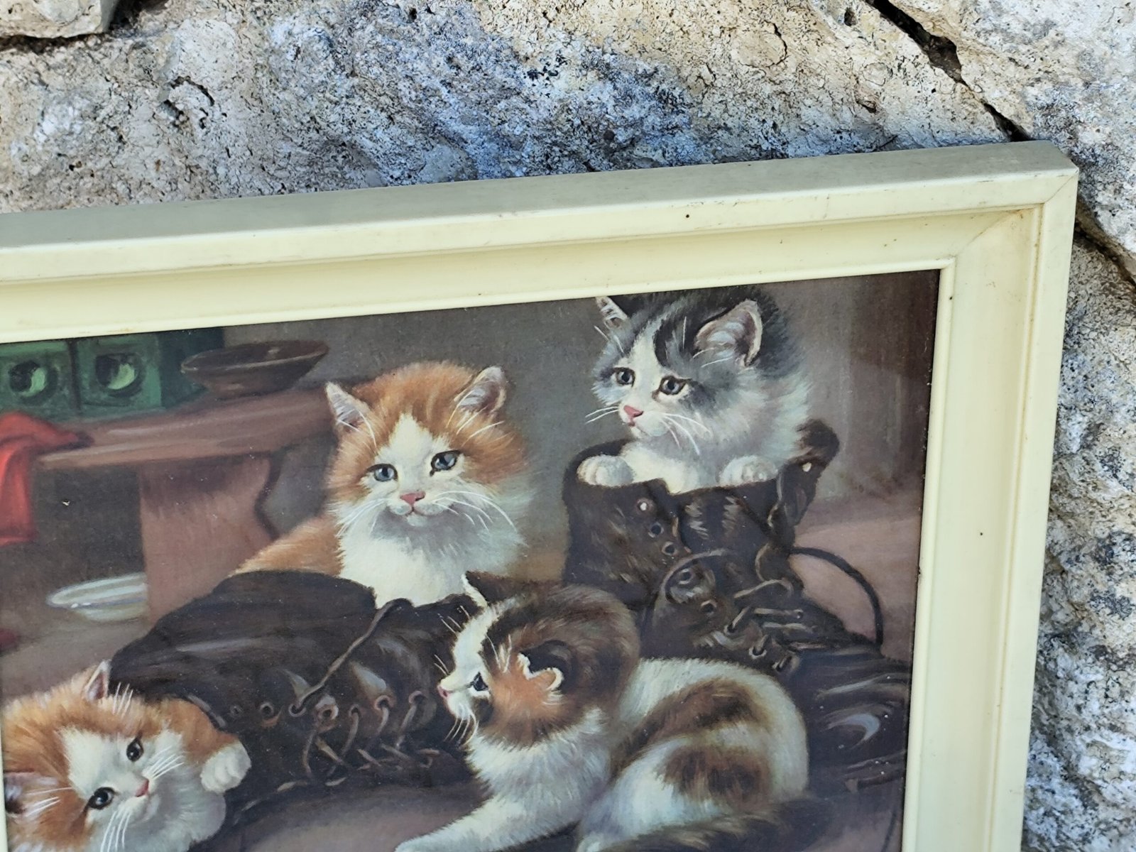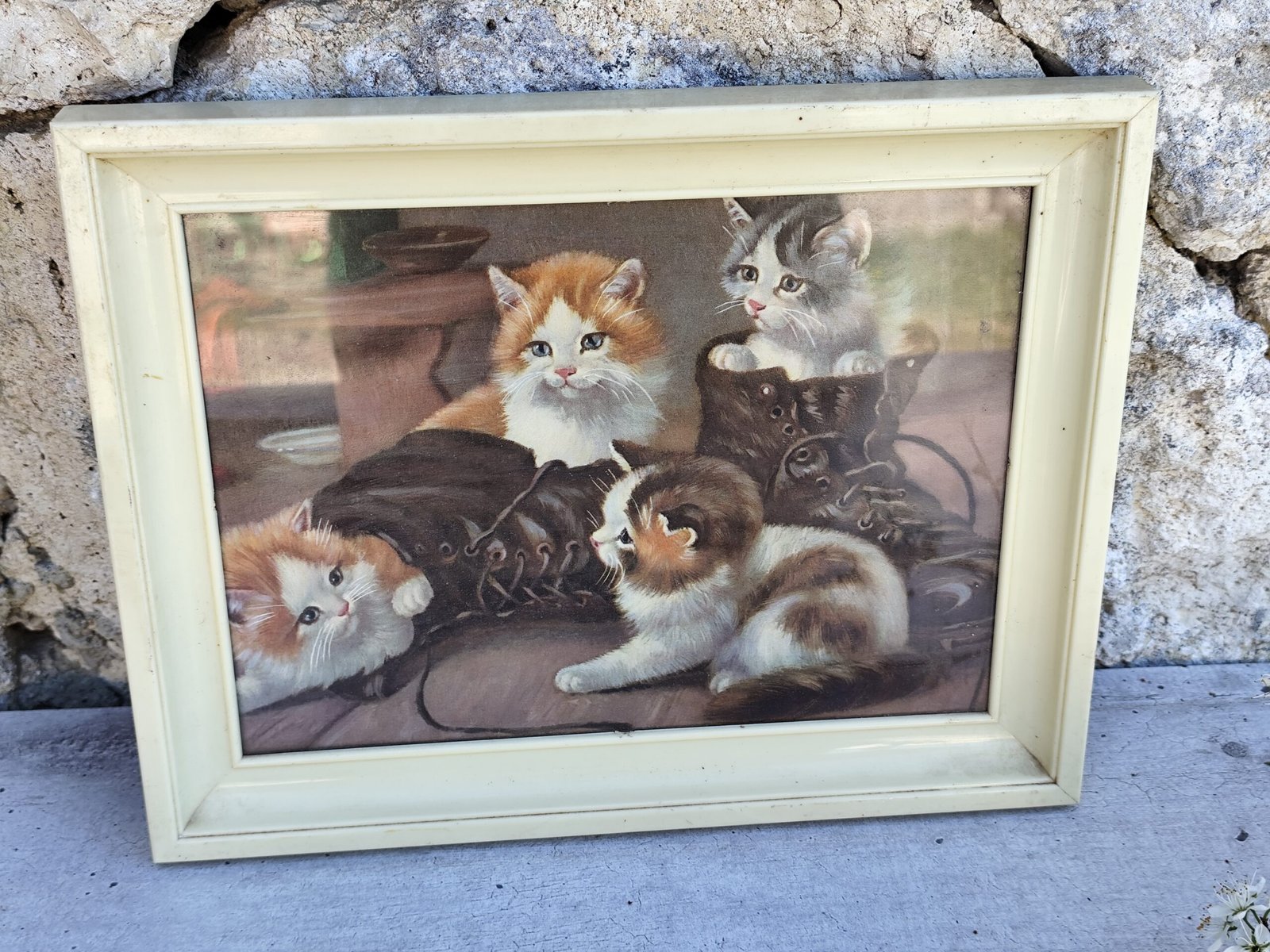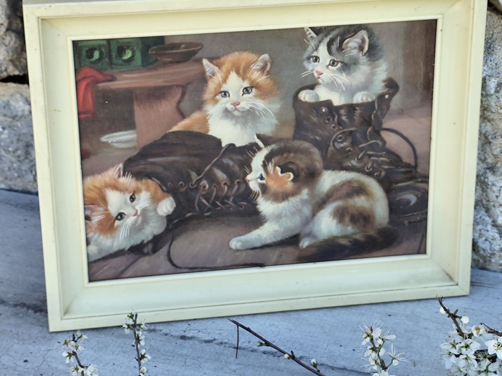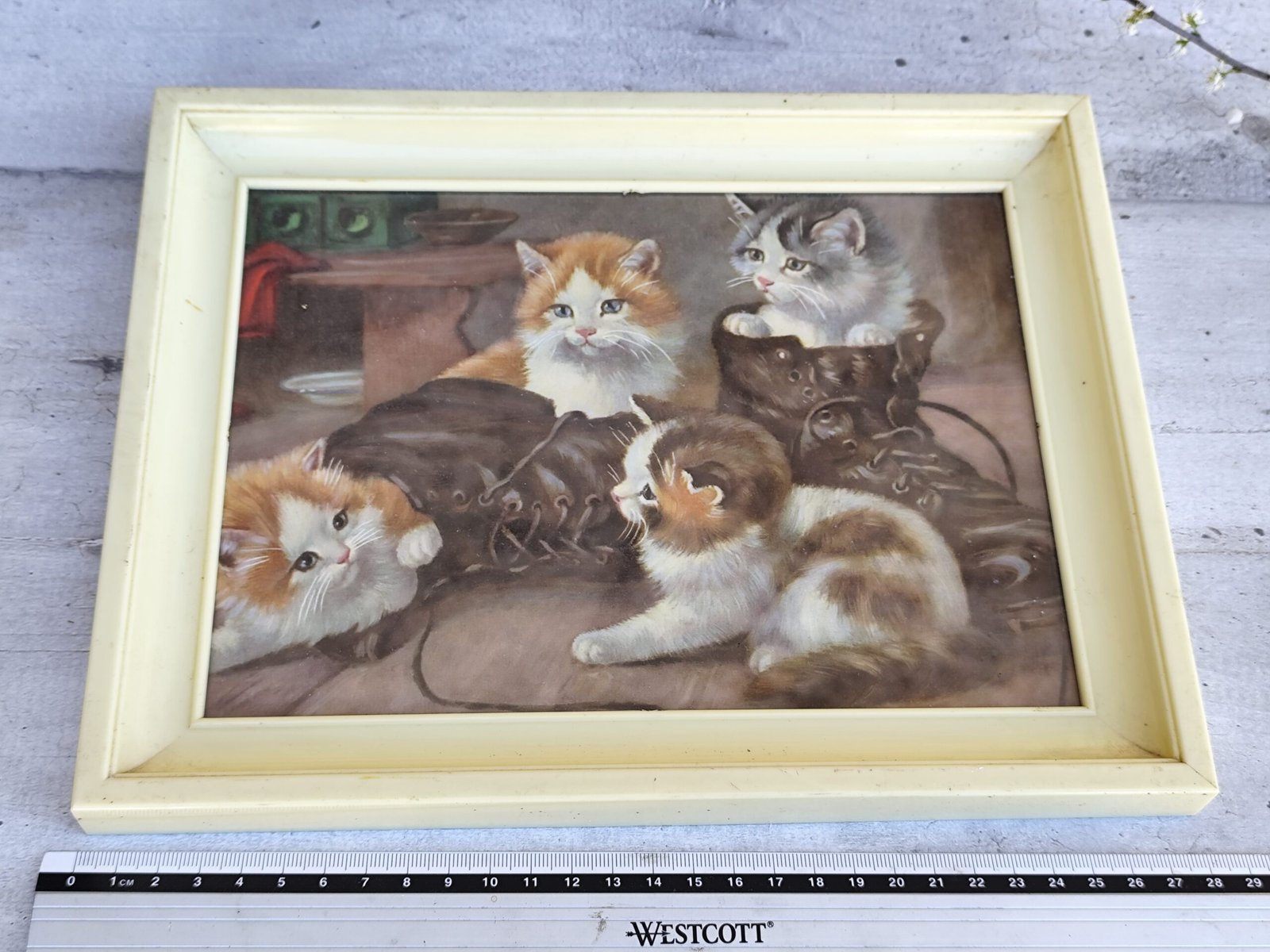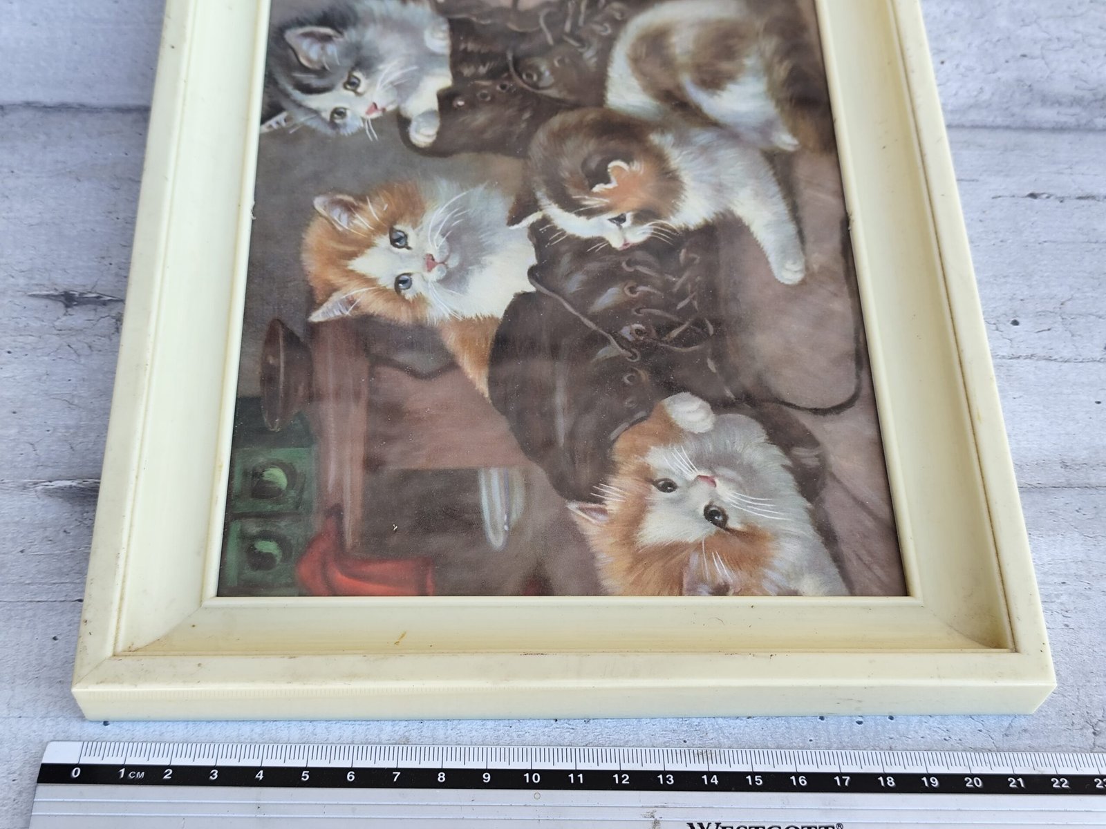 Chromo ancien de chats – Illustration rétro dans cadre en bakélite.