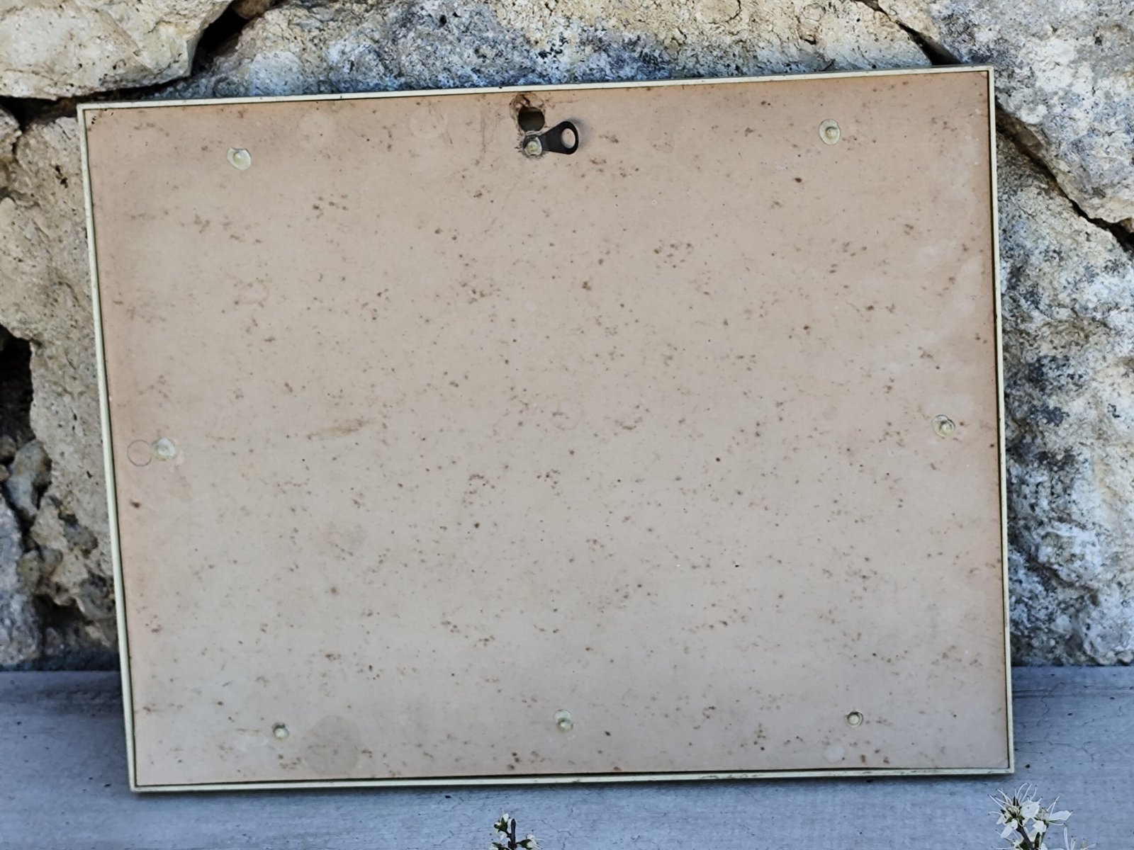 Une charmante illustration ancienne, imprimée en chromolithographie, soigneusement préservée dans son cadre en bakélite d’origine.