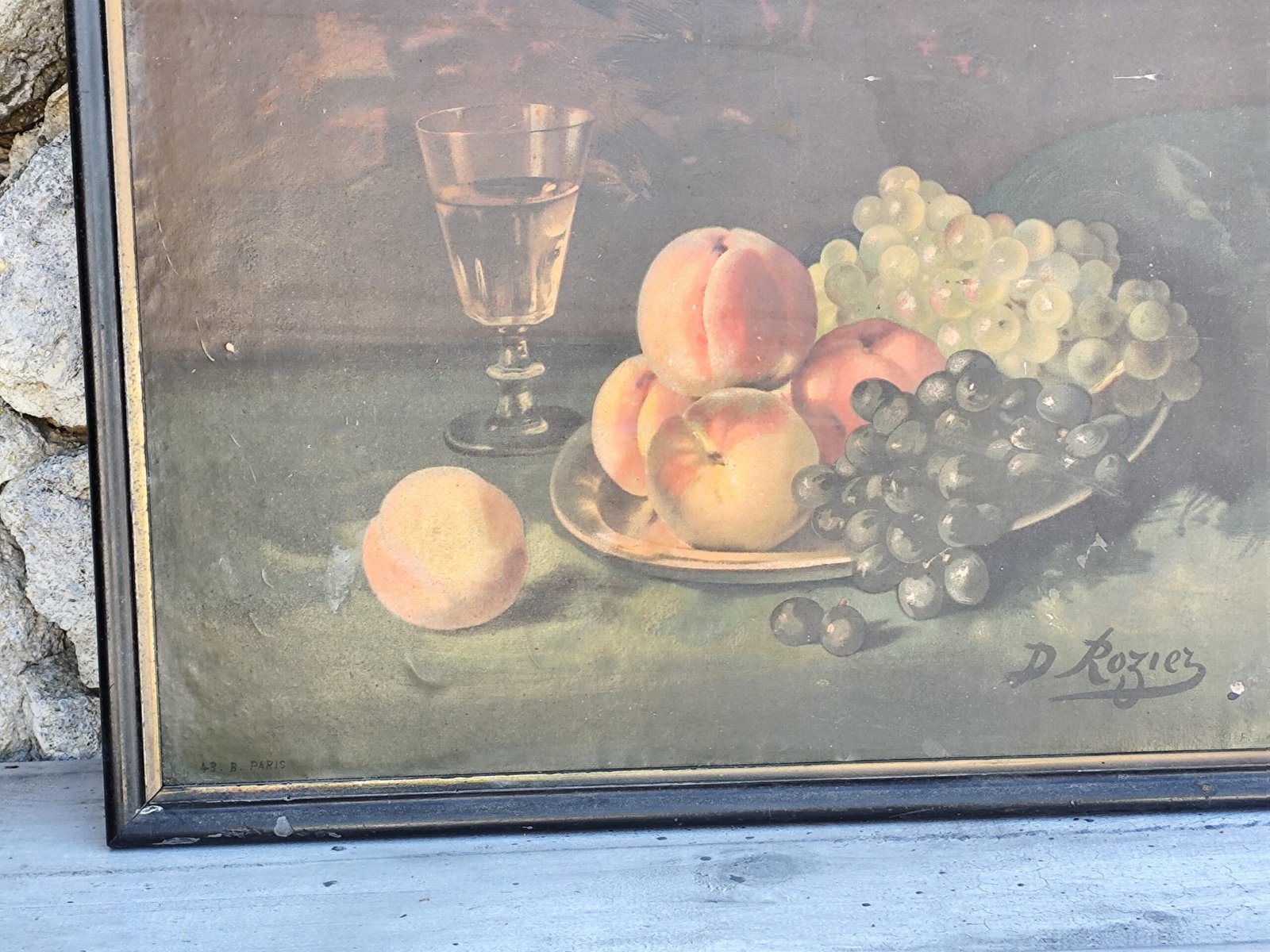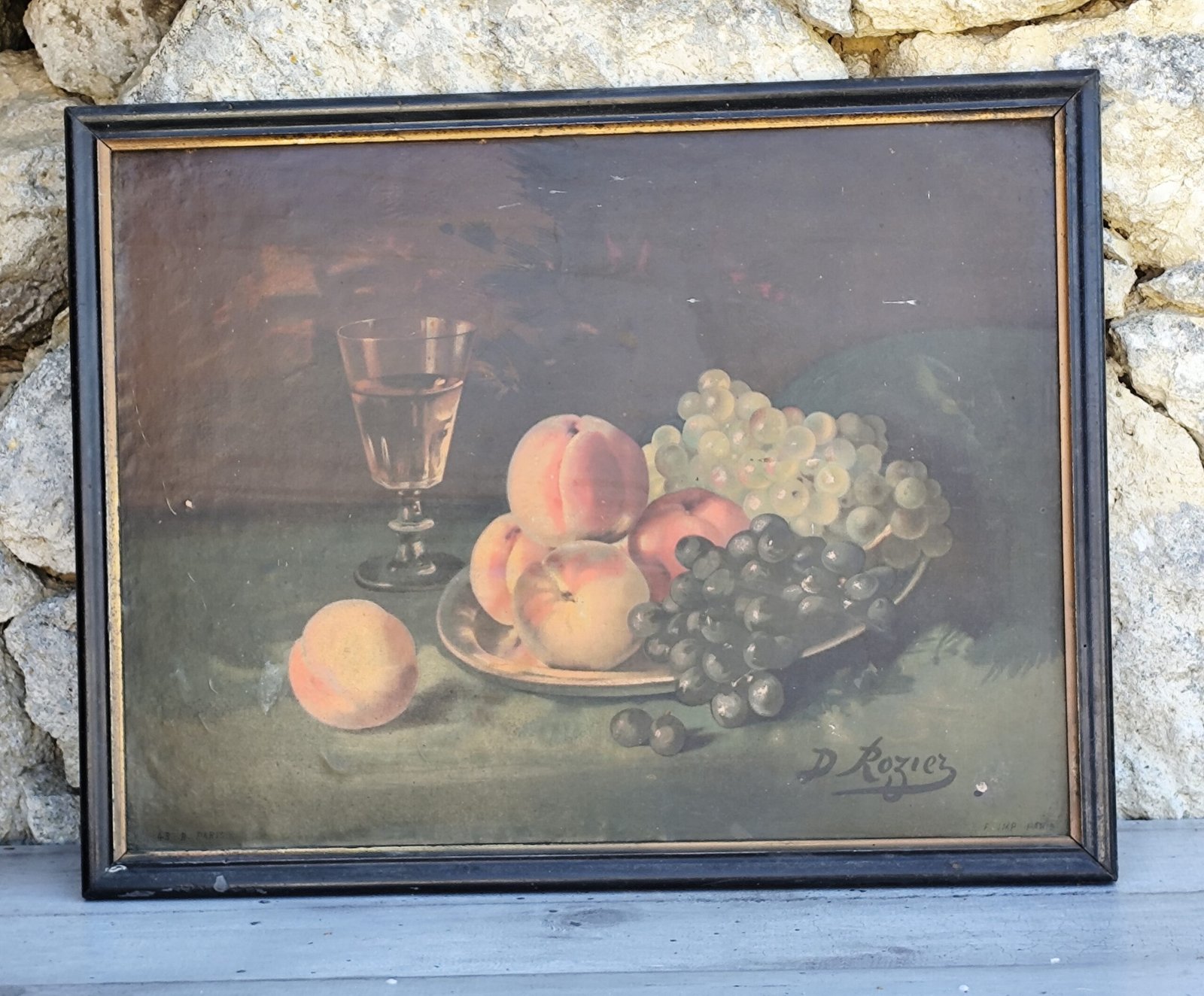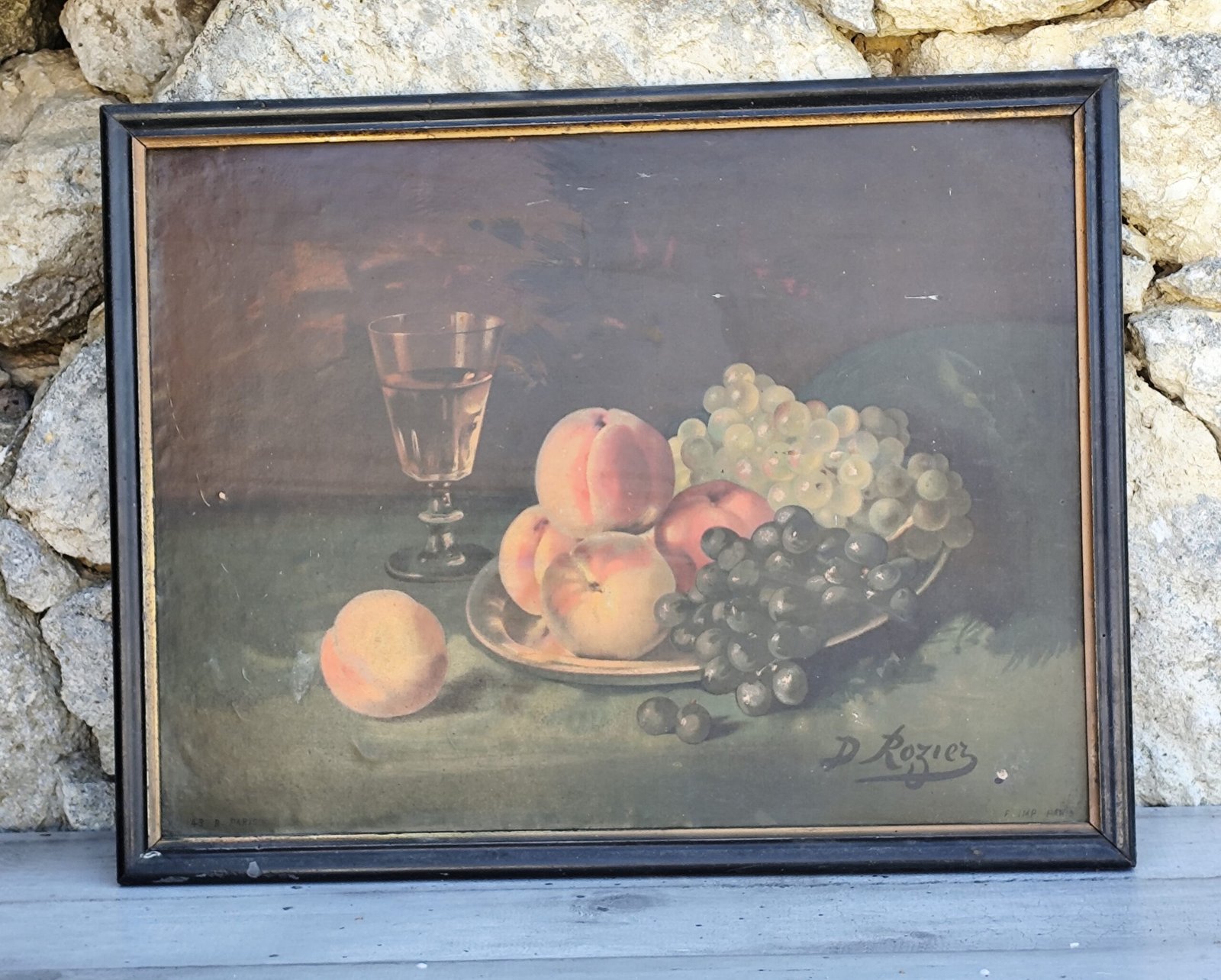 Soyez le premier à laisser votre avis sur “Chromo ancien nature morte – Fruits & verre – Signé D. Rozier – Encadrement vintage”