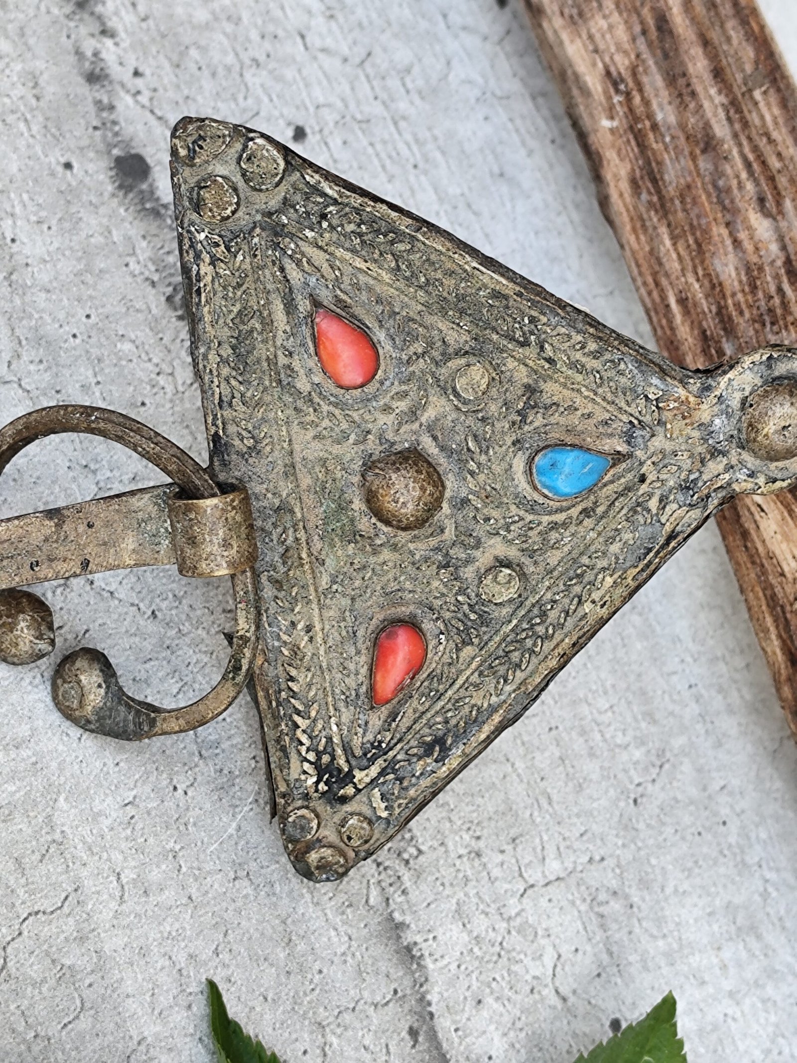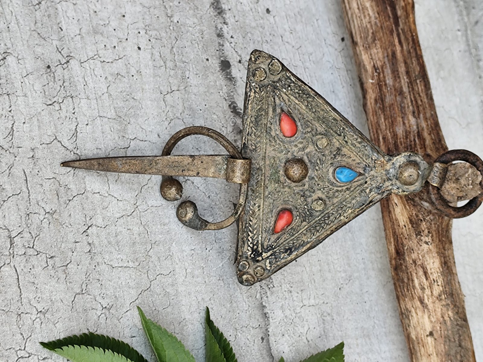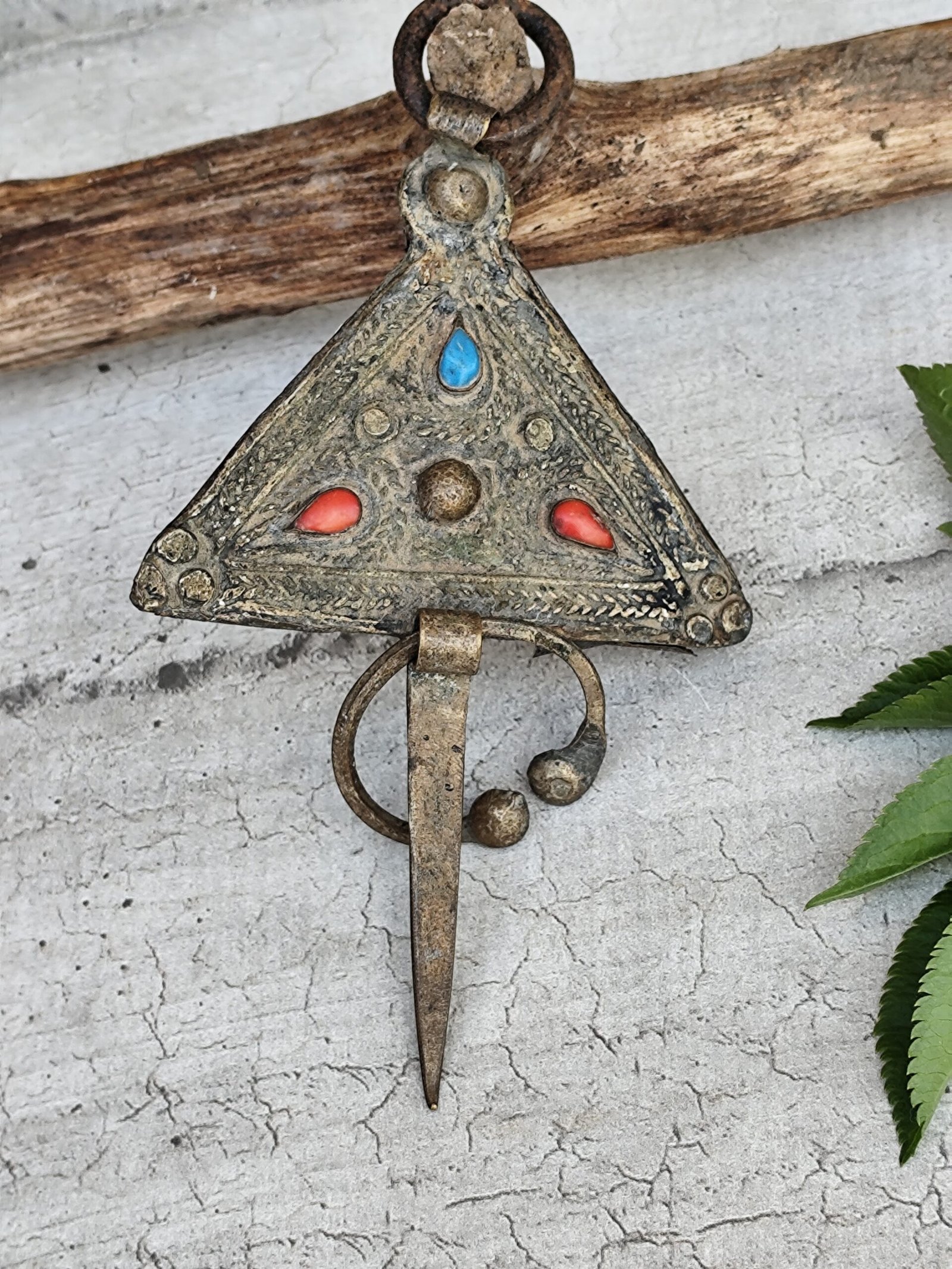 Fibule marocaine ancienne – Corail & Turquoise – Pièce artisanale berbère.