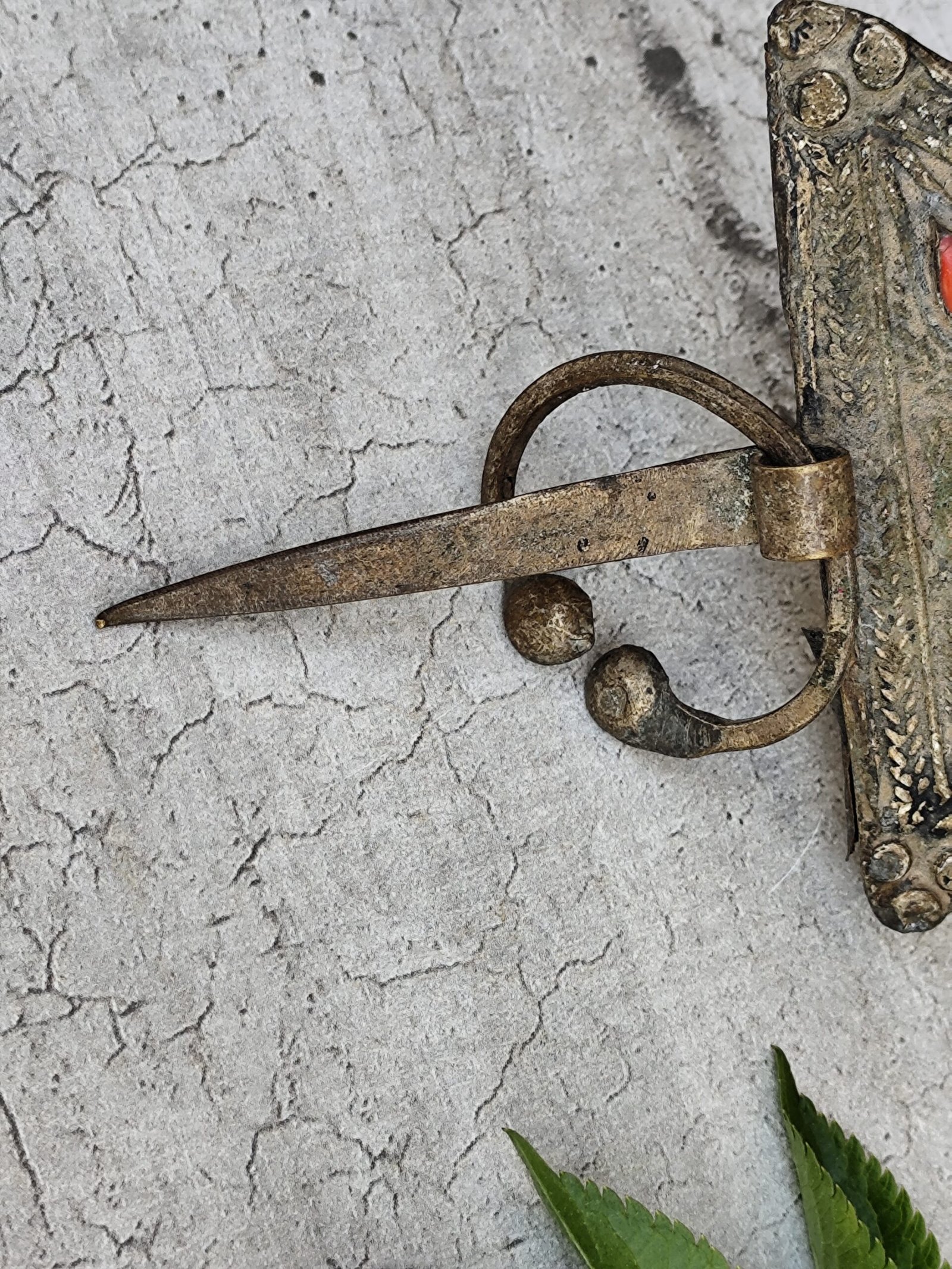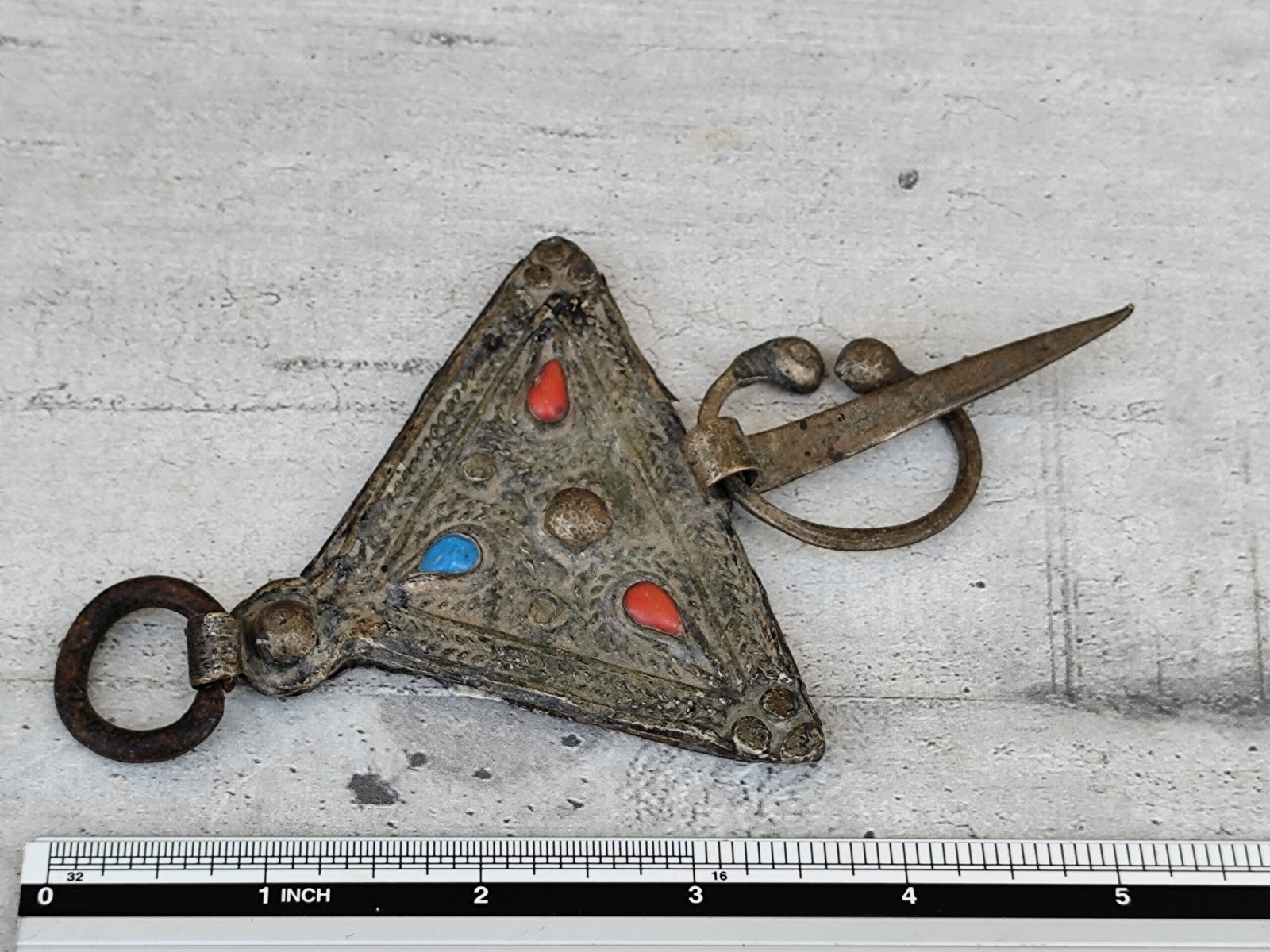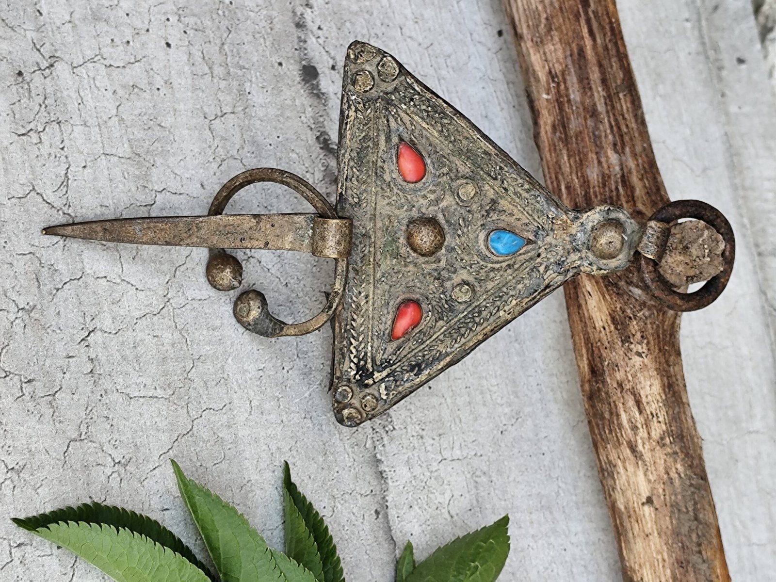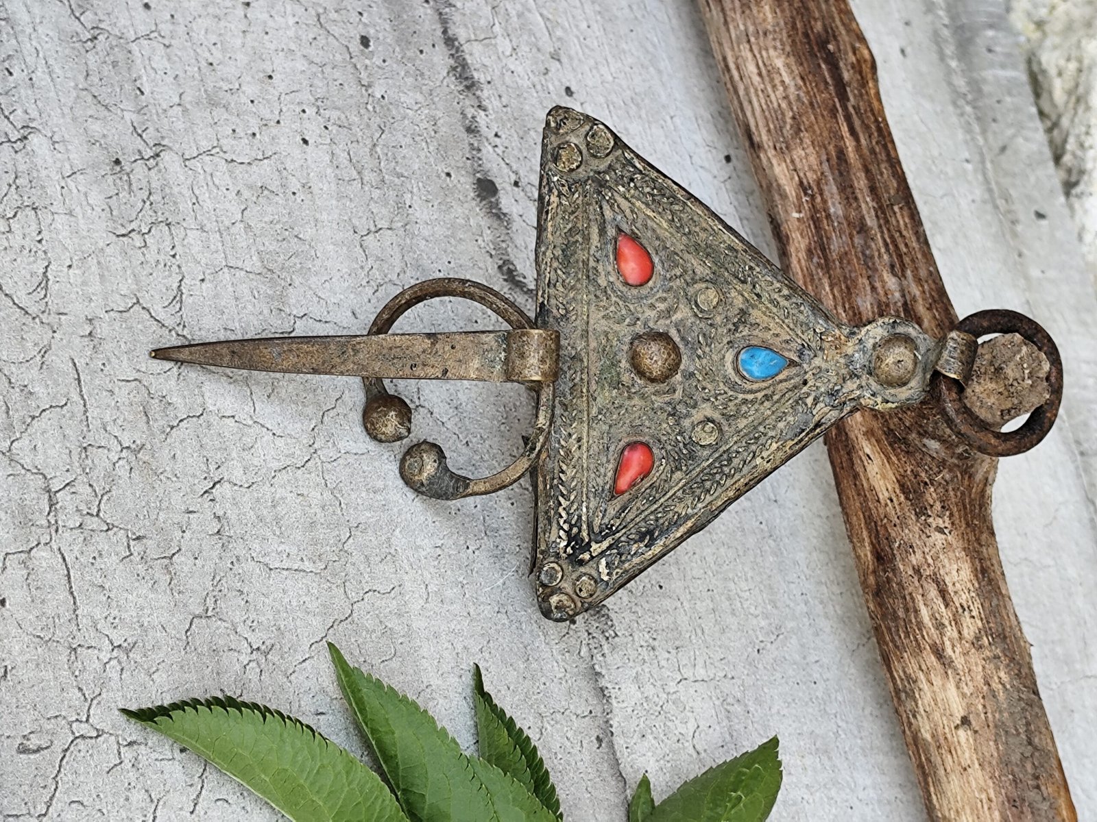 Fibule marocaine ancienne – Corail & Turquoise – Pièce artisanale berbère.