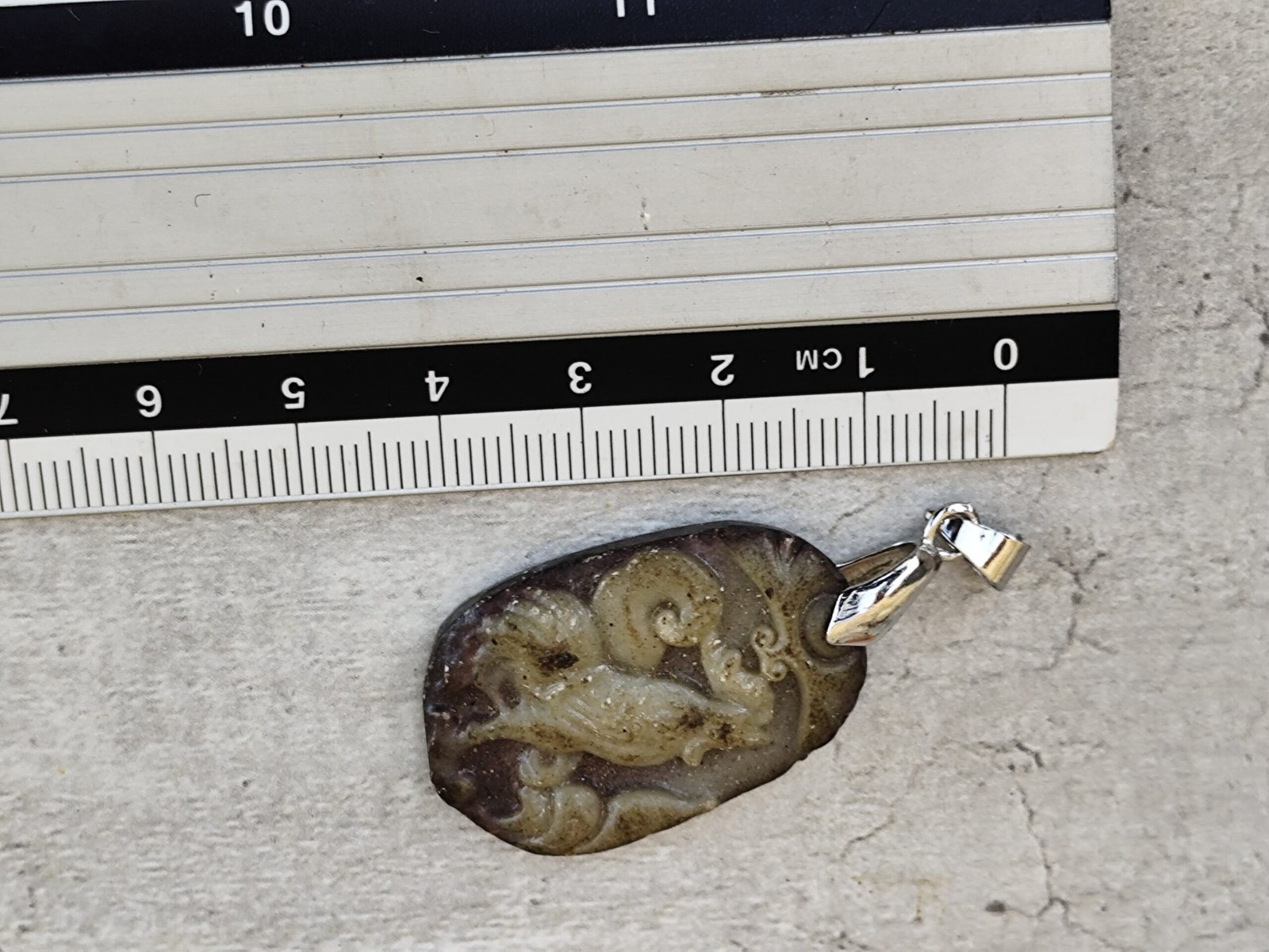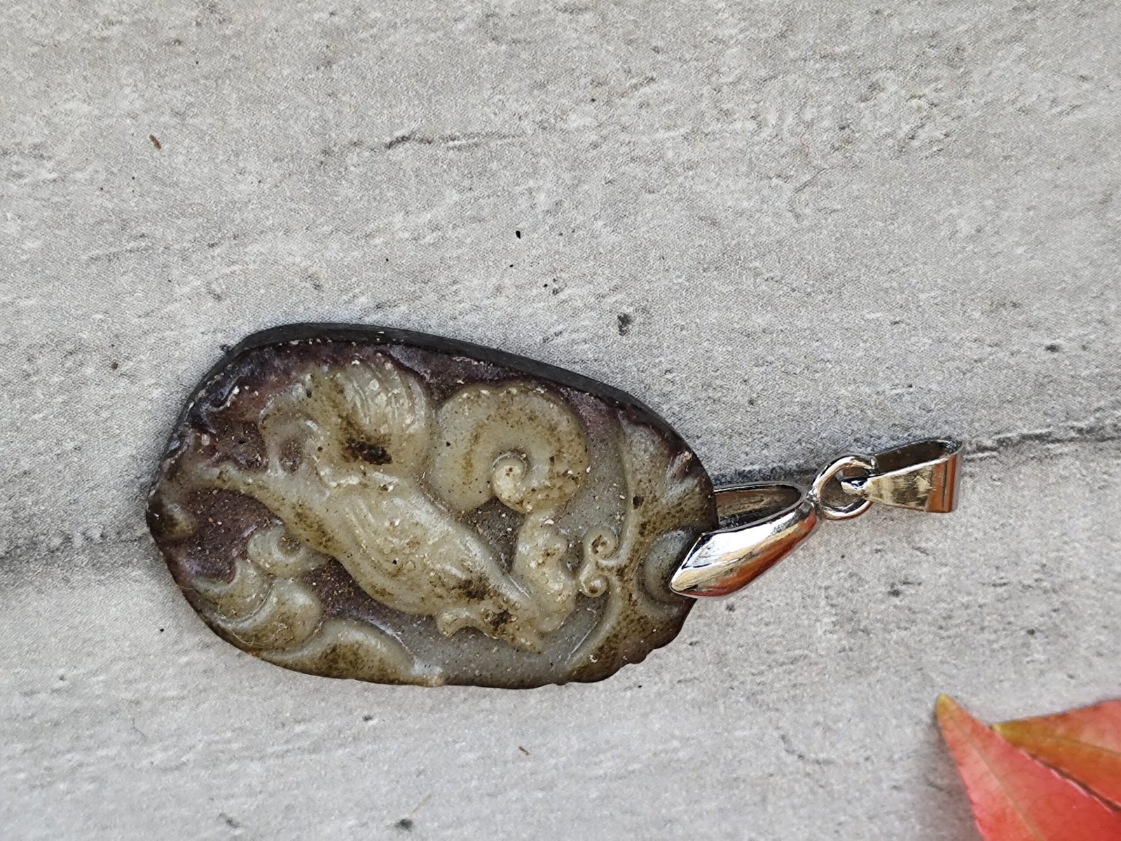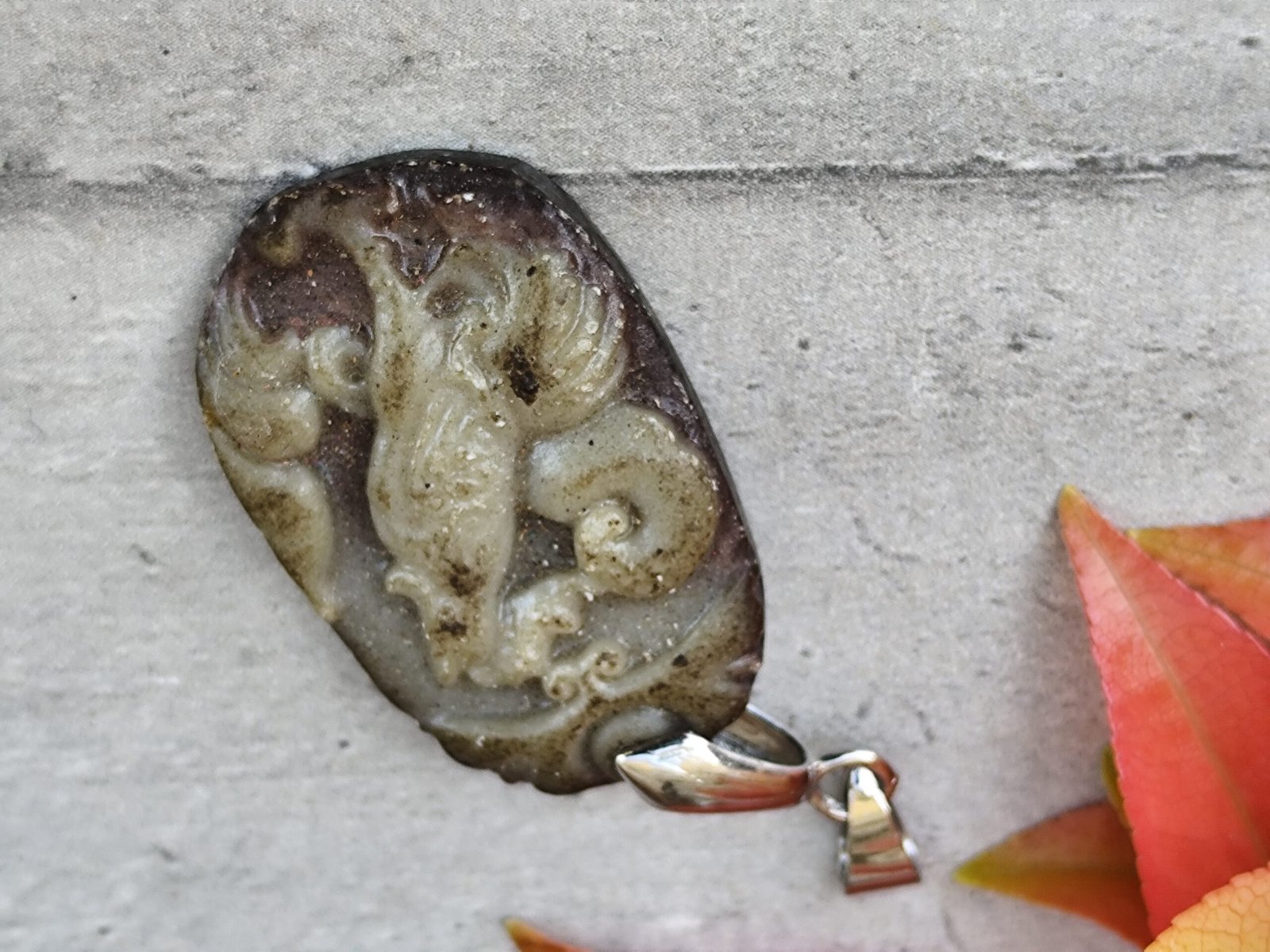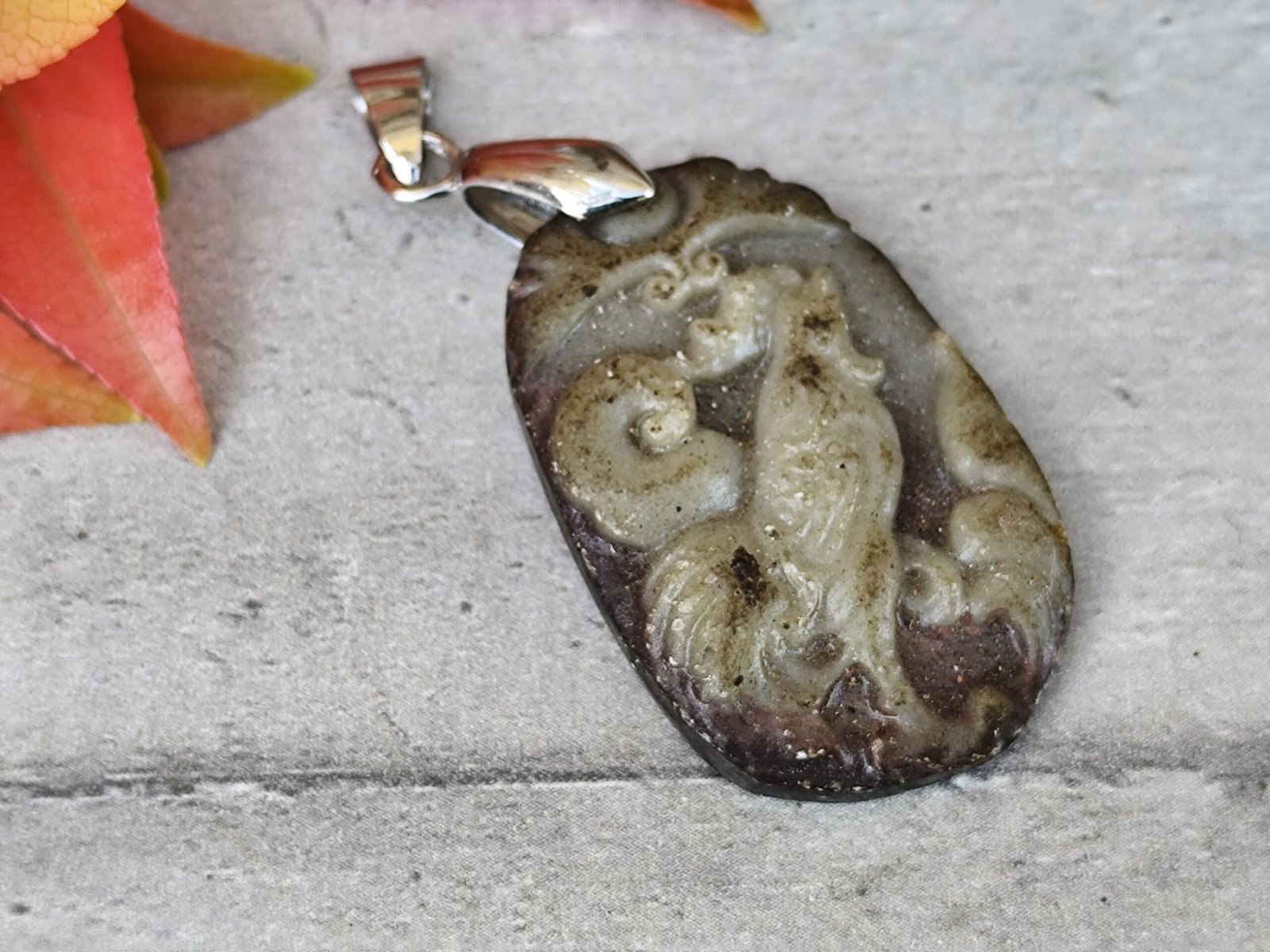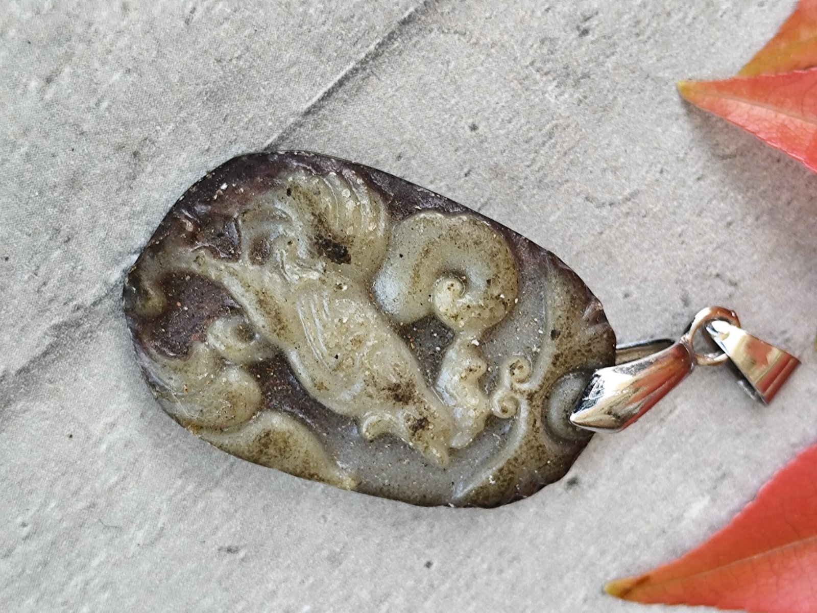 Sculpté dans une pierre naturelle aux nuances terreuses — bruns, verts et gris mêlés — ce pendentif représente un coq stylisé, figure emblématique de la culture chinoise.