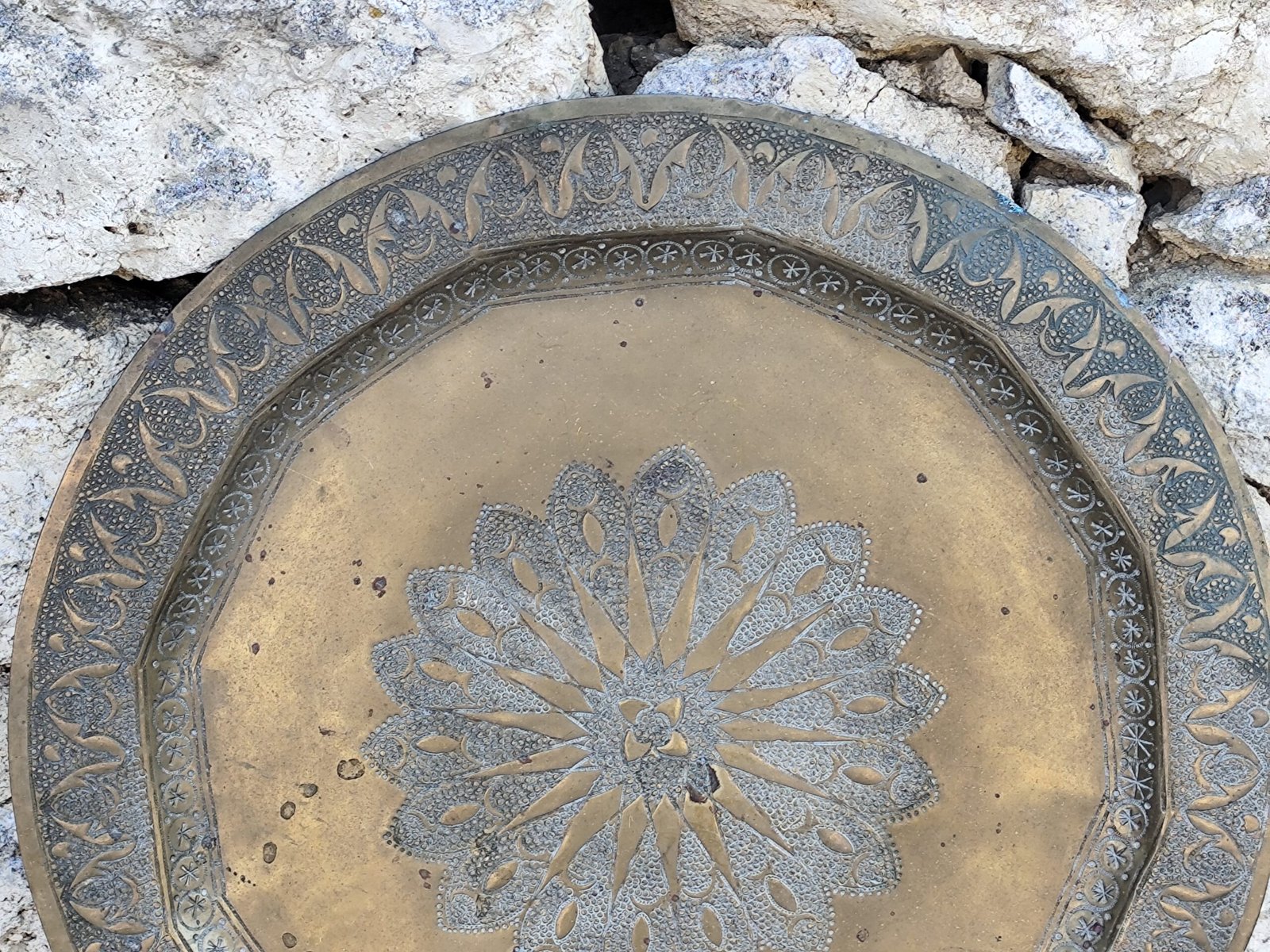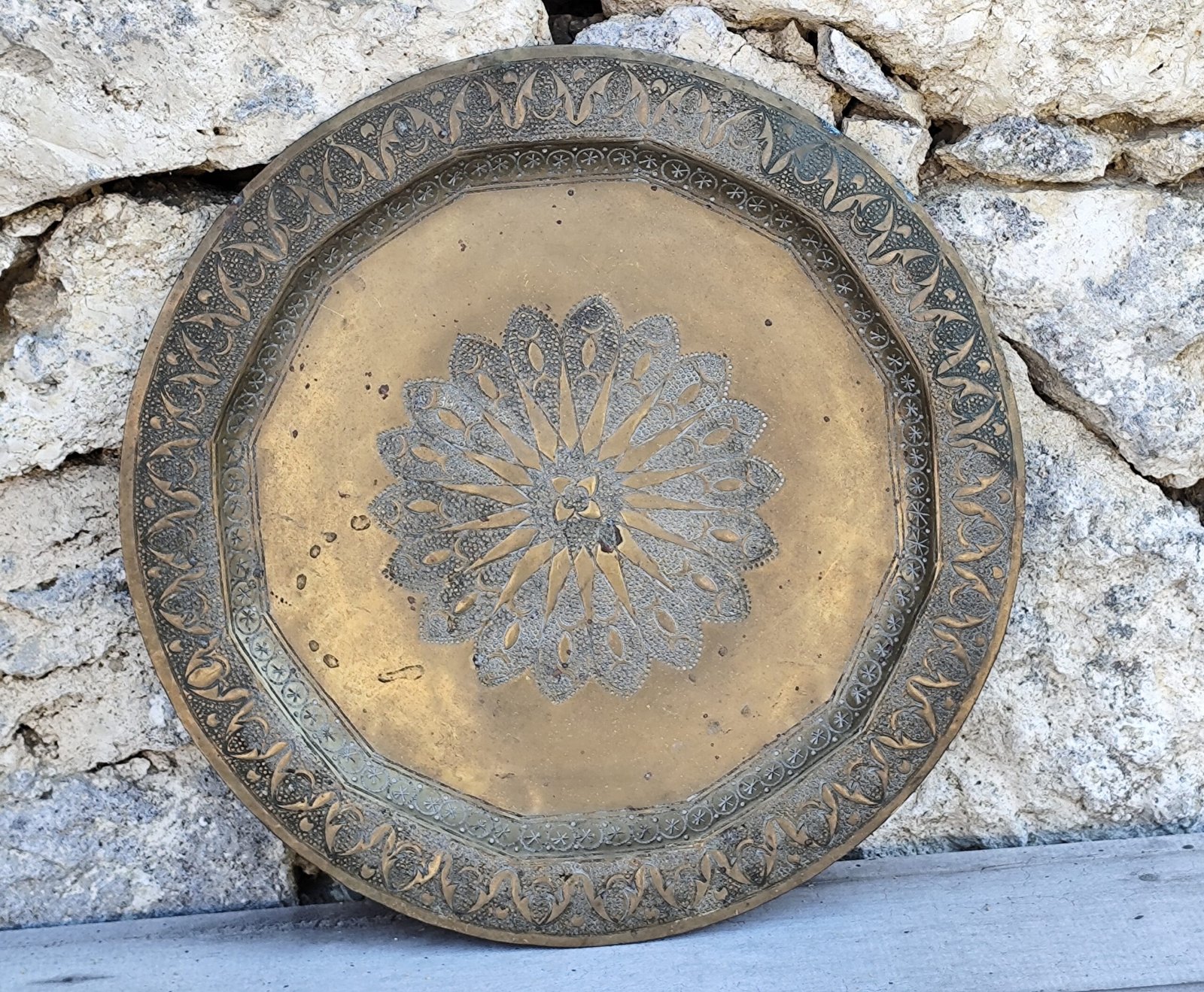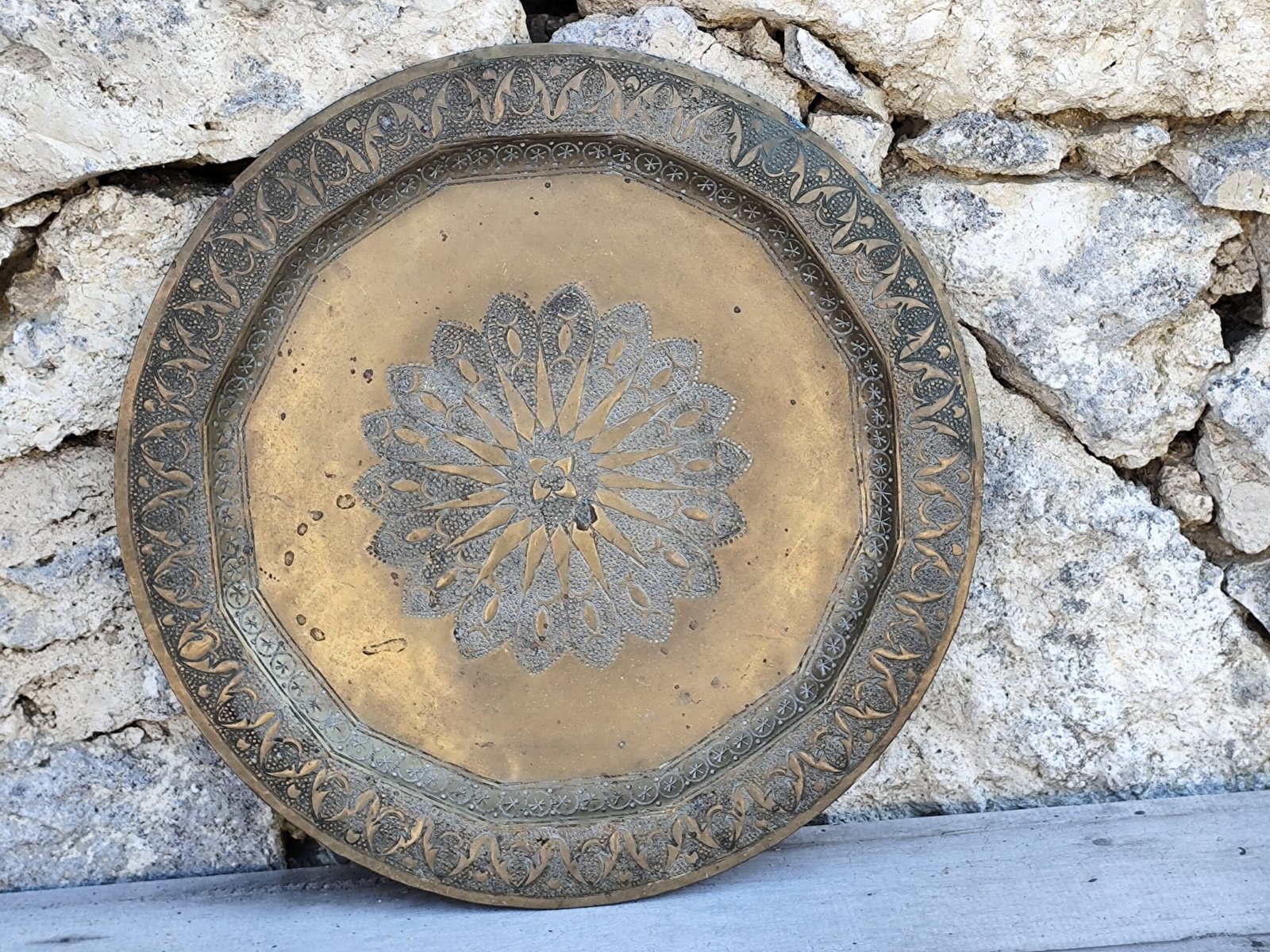 Plateau marocain en laiton 35 cm – Plateau décoratif artisanal gravé – Artisanat du Maroc – Décoration bohème et orientale.