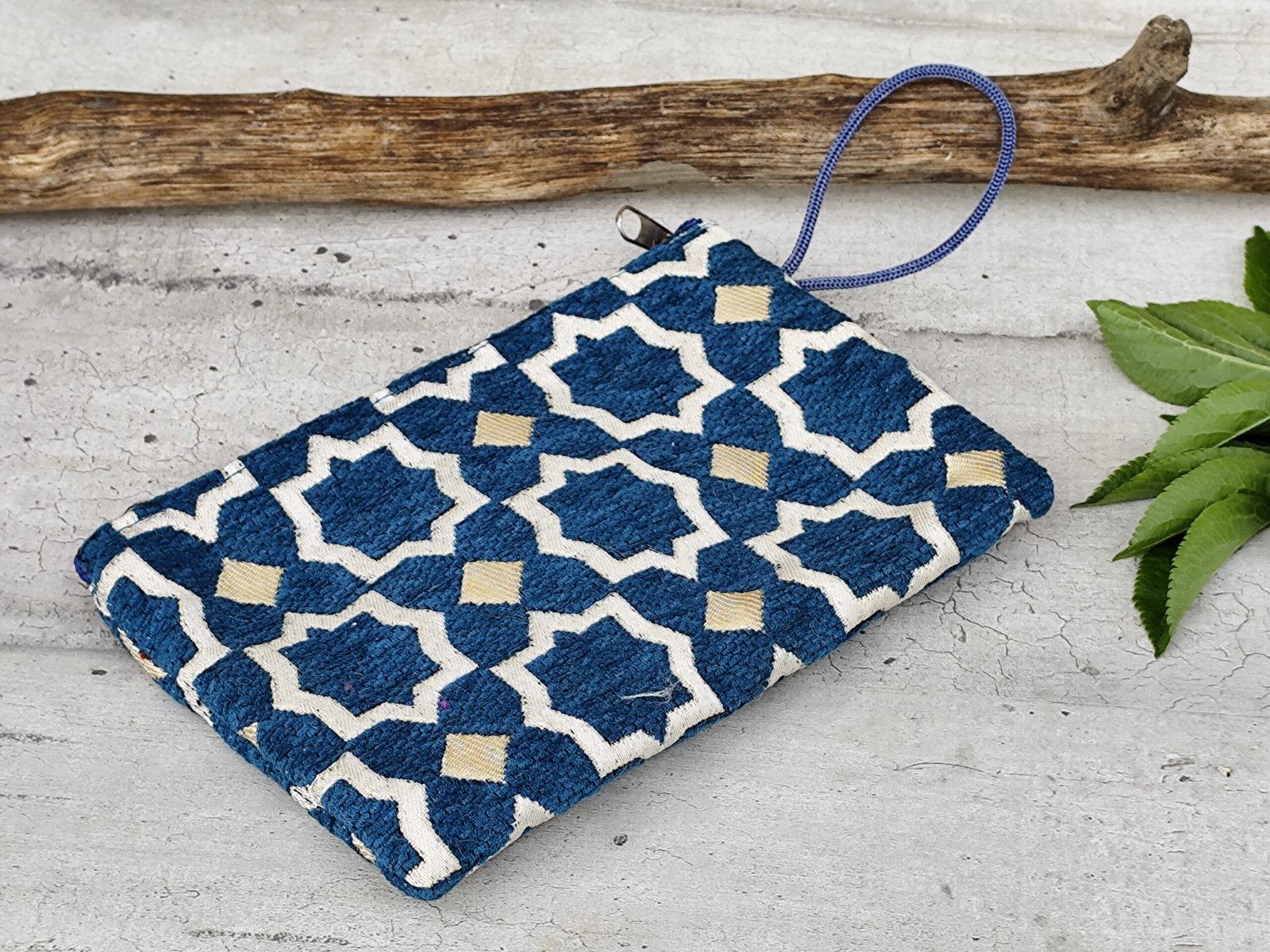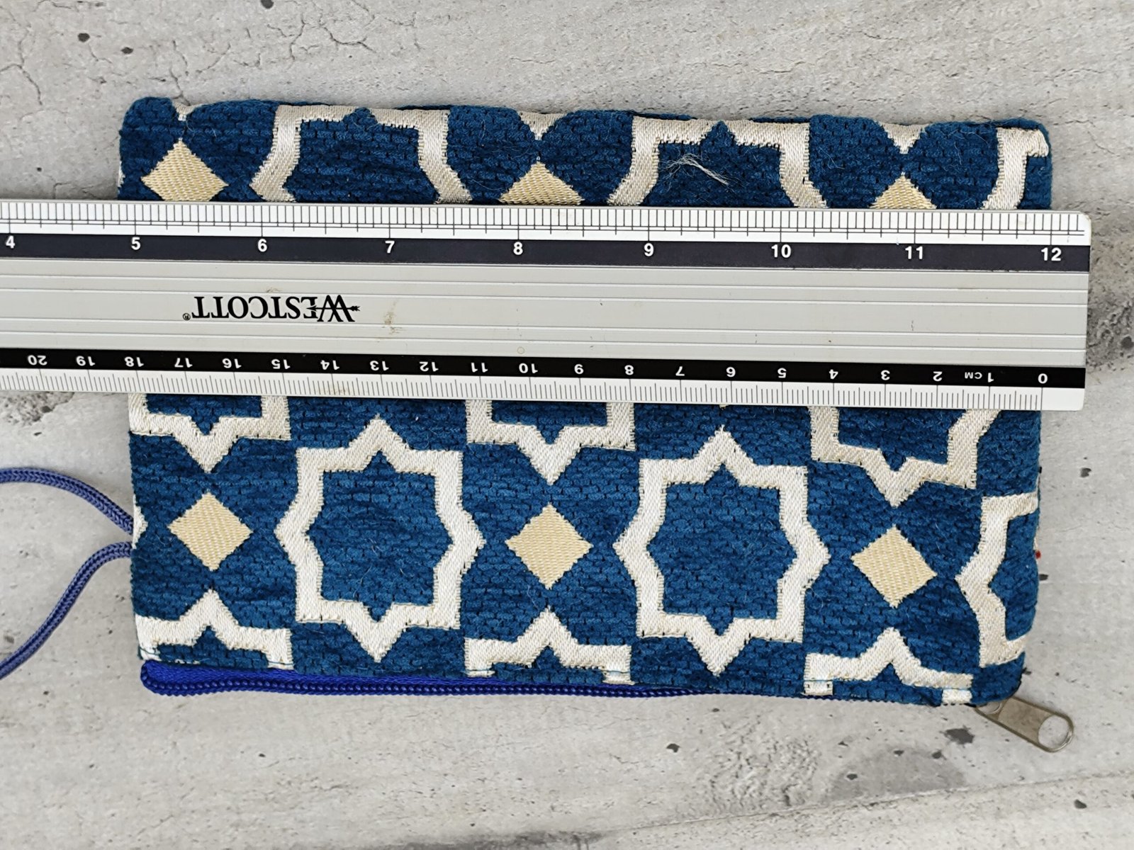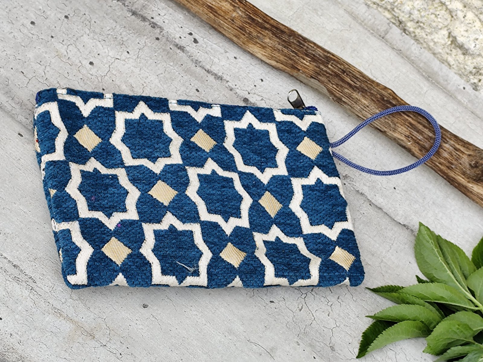Cette pochette kilim est une petite alliée du quotidien, tissée dans un motif géométrique inspiré des textiles traditionnels. Ses étoiles bleues profondes, soulignées de blanc et de beige, évoquent les nuits claires du désert et les chemins nomades.