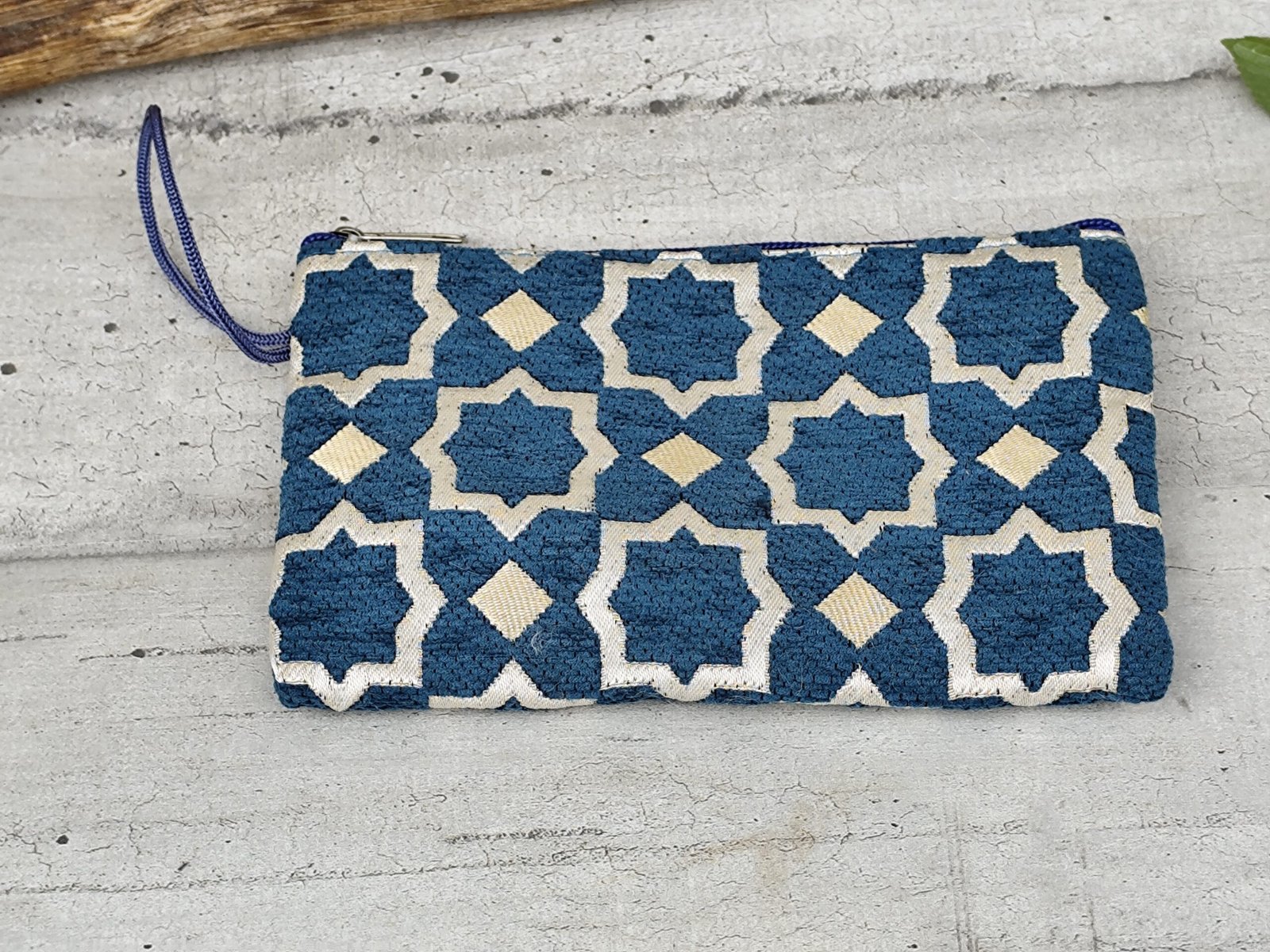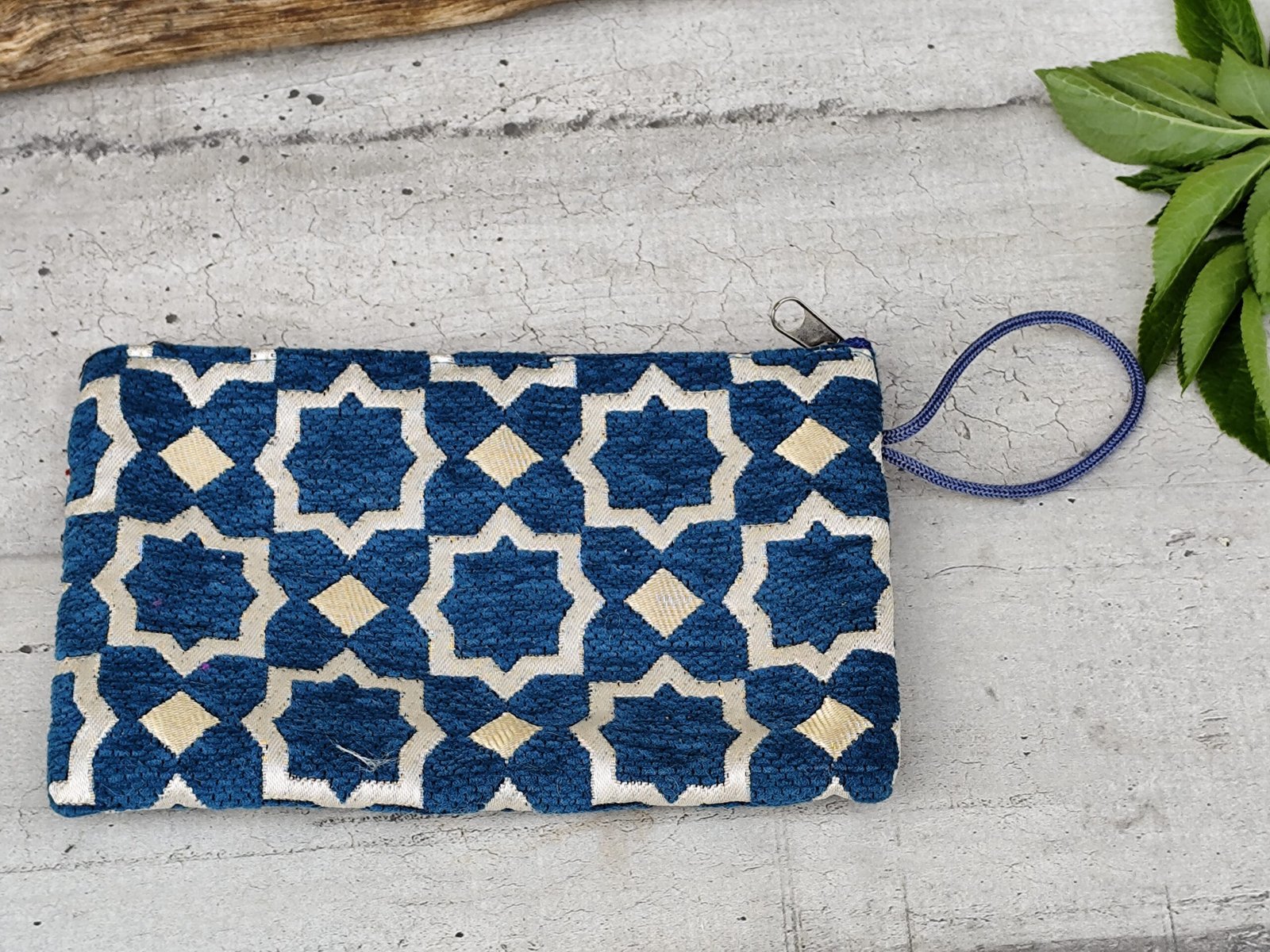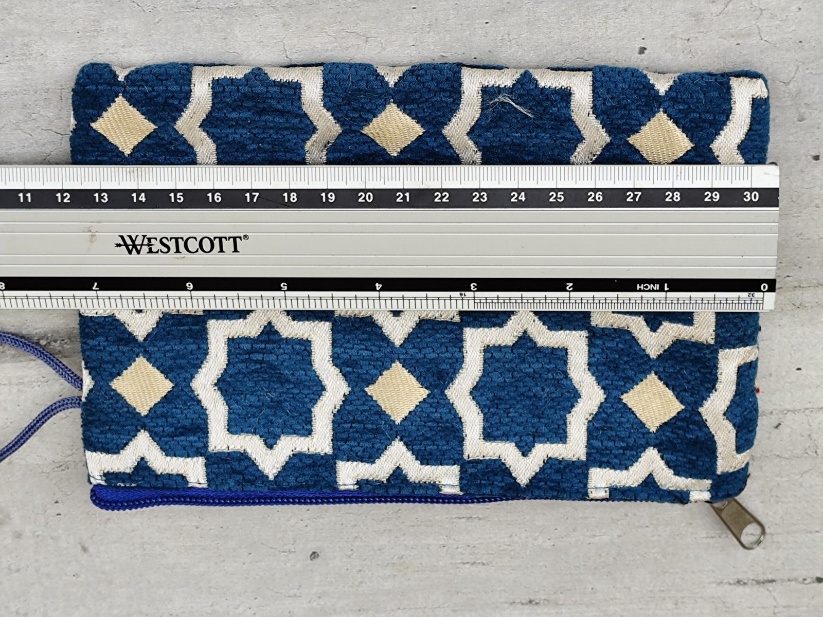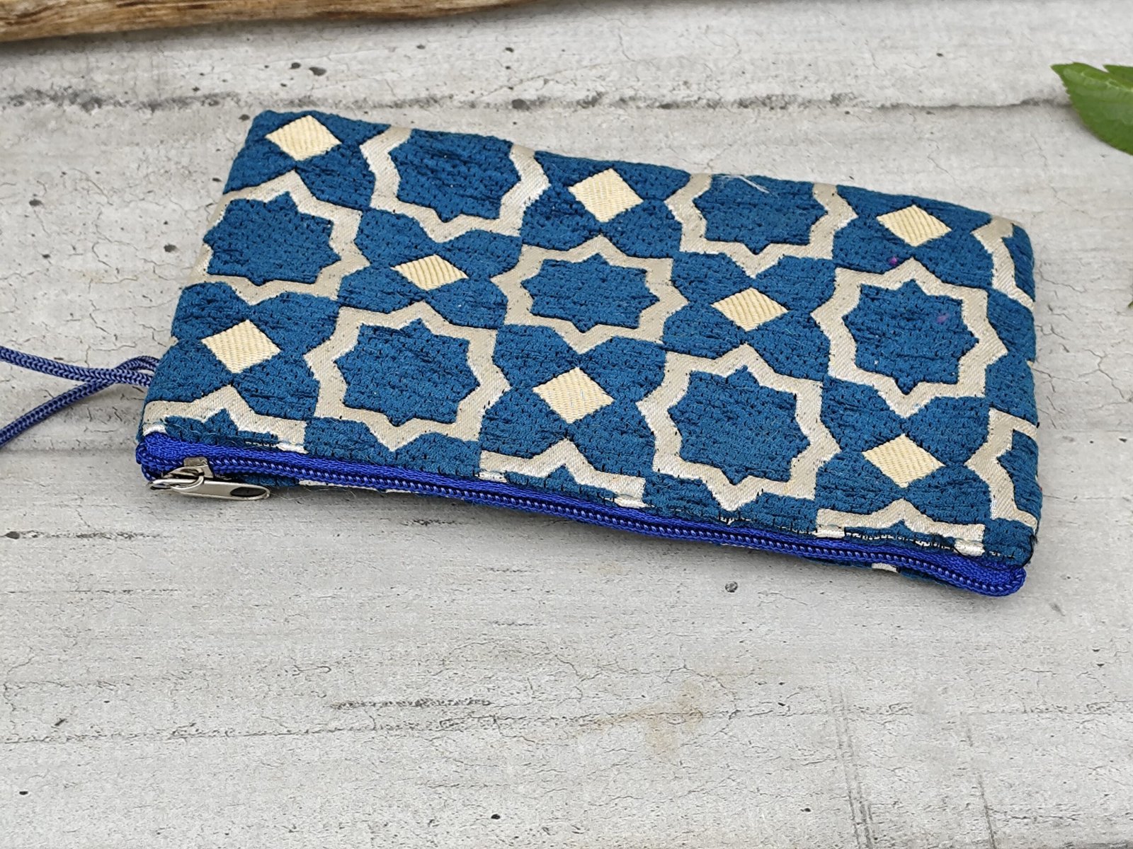 Cette pochette kilim est une petite alliée du quotidien, tissée dans un motif géométrique inspiré des textiles traditionnels. Ses étoiles bleues profondes, soulignées de blanc et de beige, évoquent les nuits claires du désert et les chemins nomades.