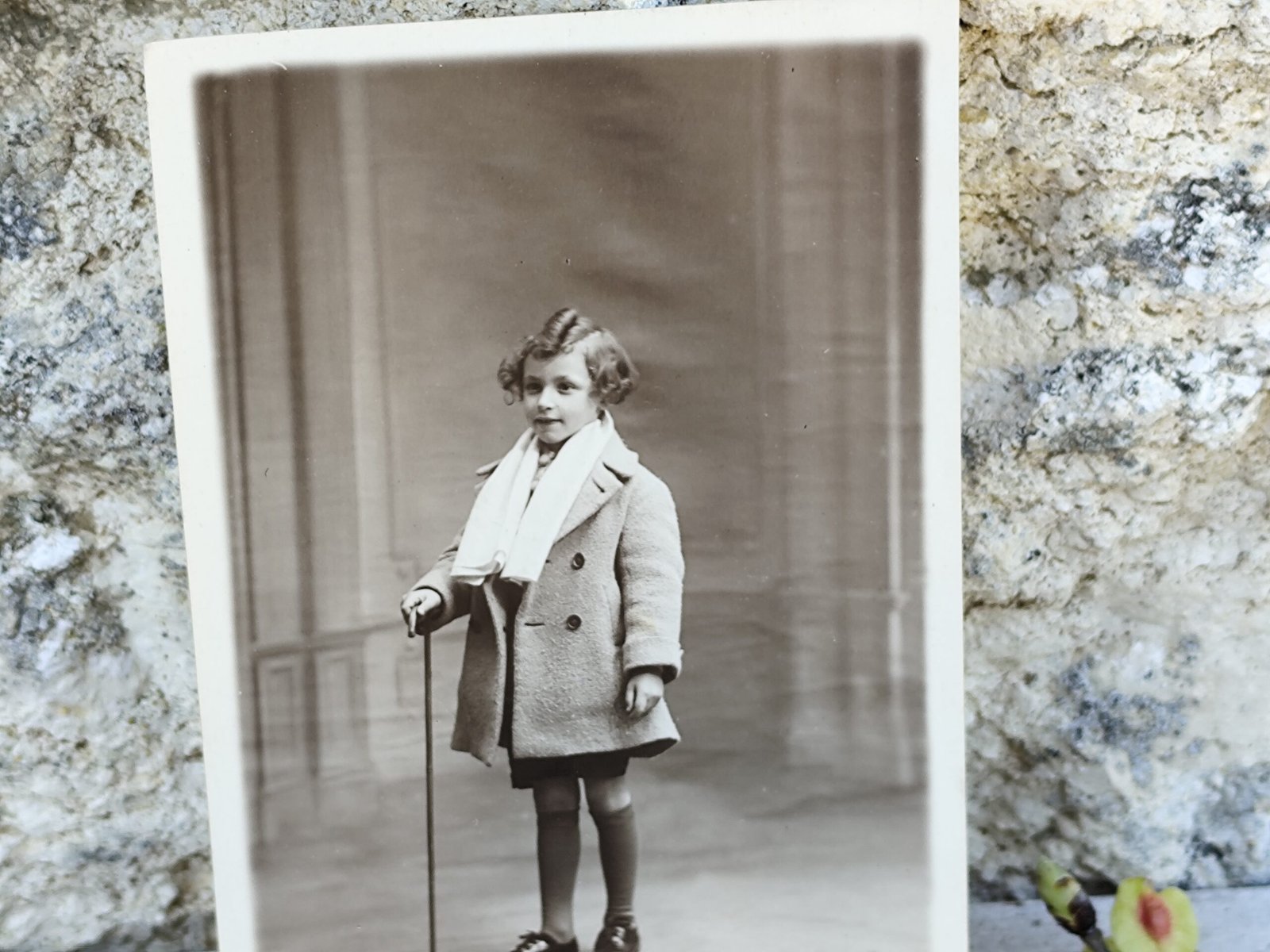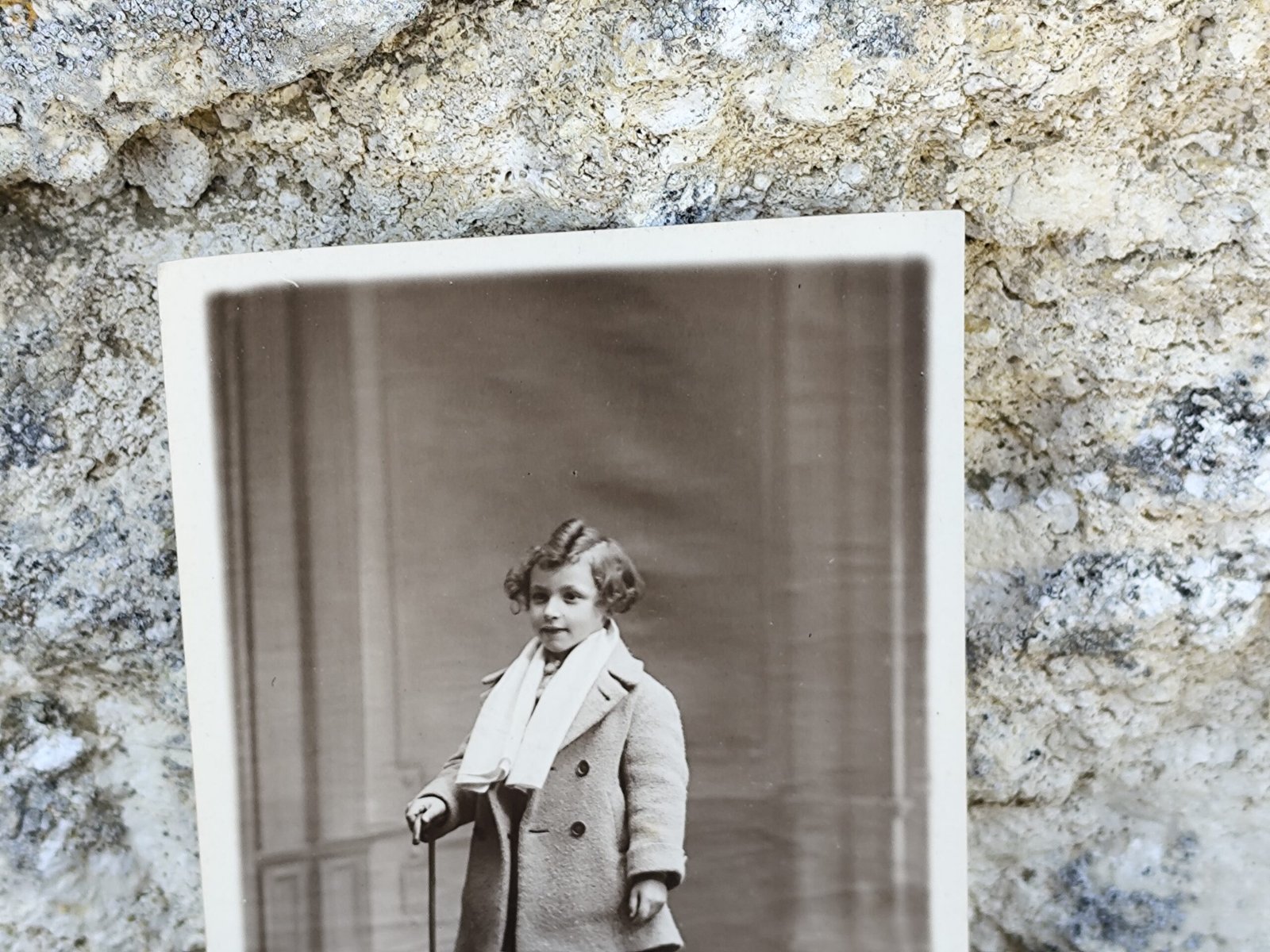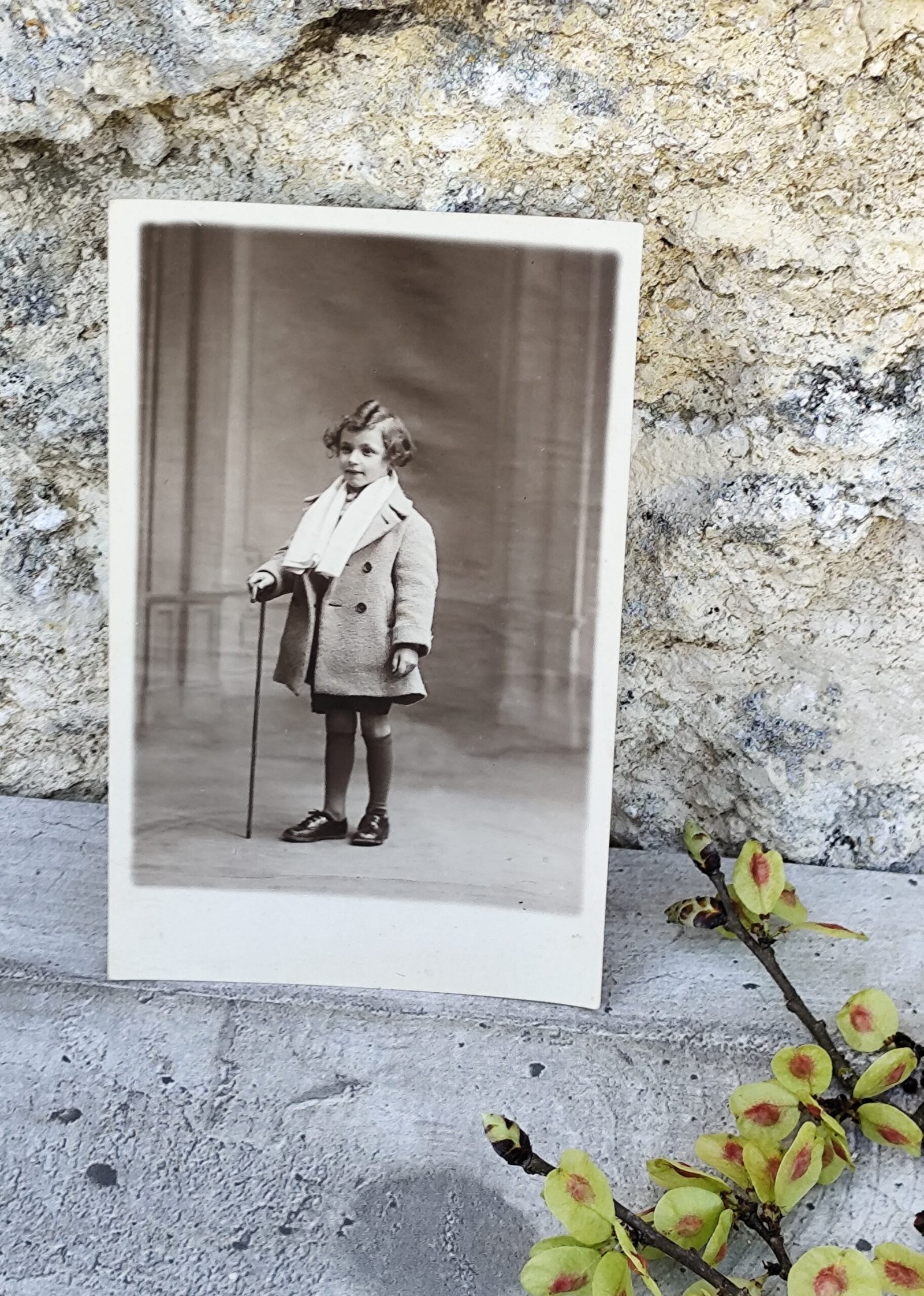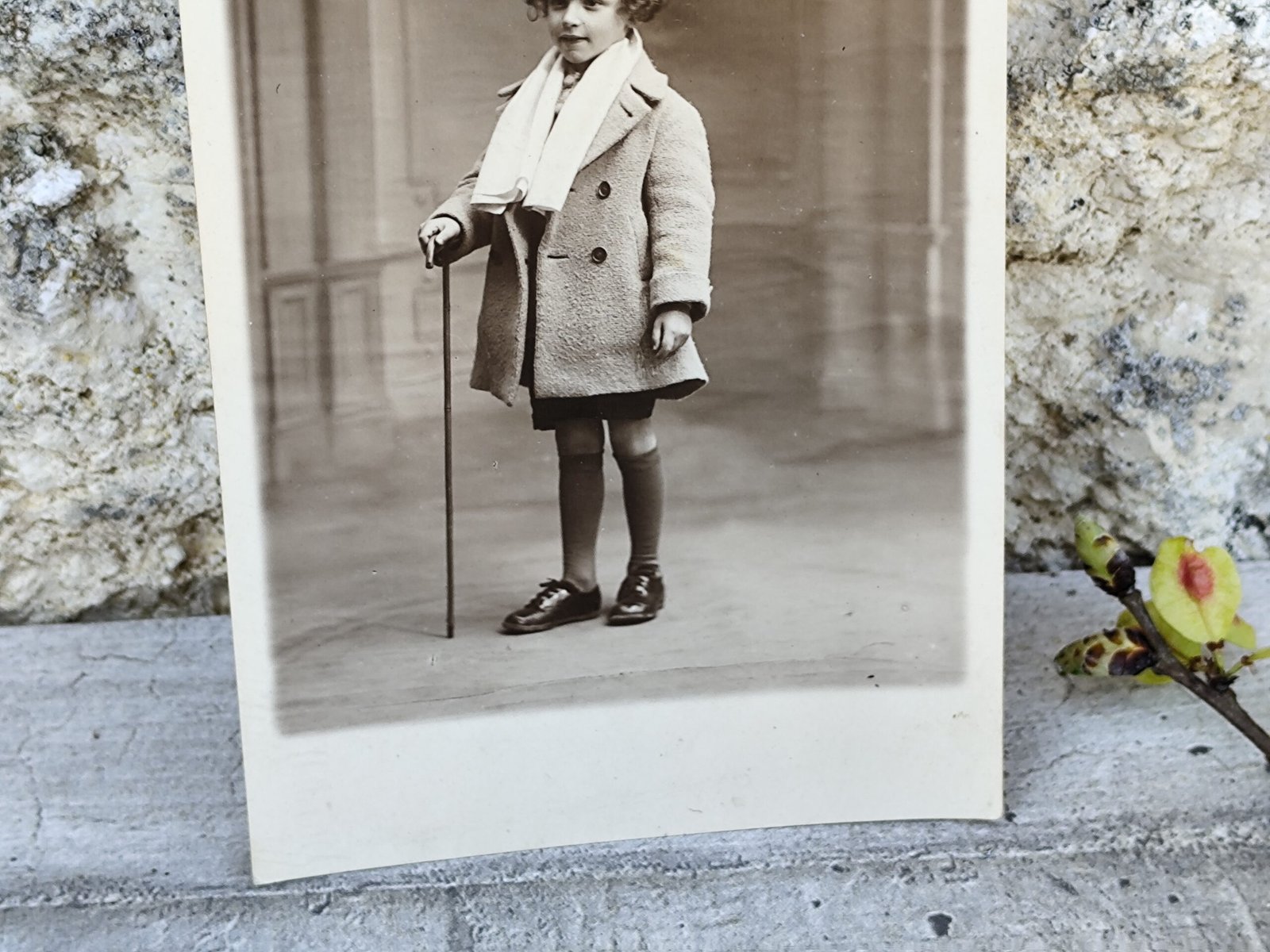 Le manteau croisé, l’écharpe nouée, les chaussettes hautes… tout évoque une époque où l’on posait avec sérieux, même lorsqu’on n’avait que quelques années.
