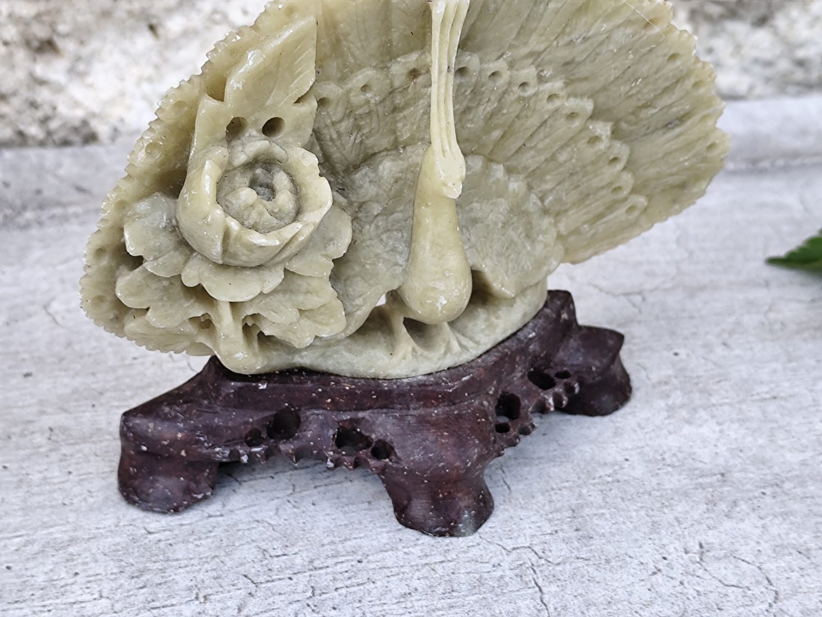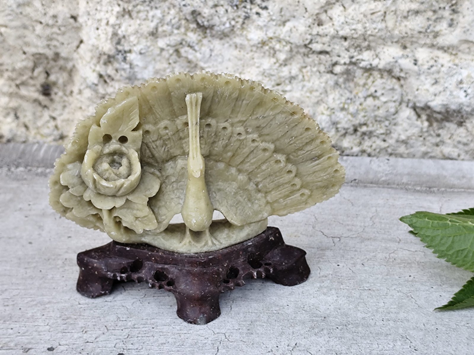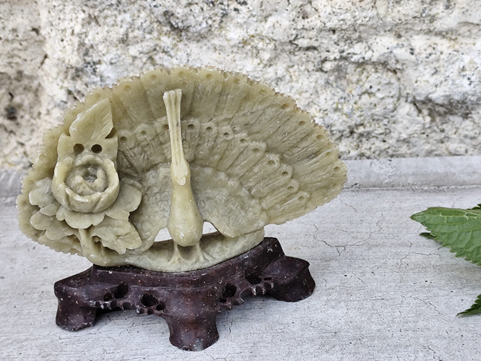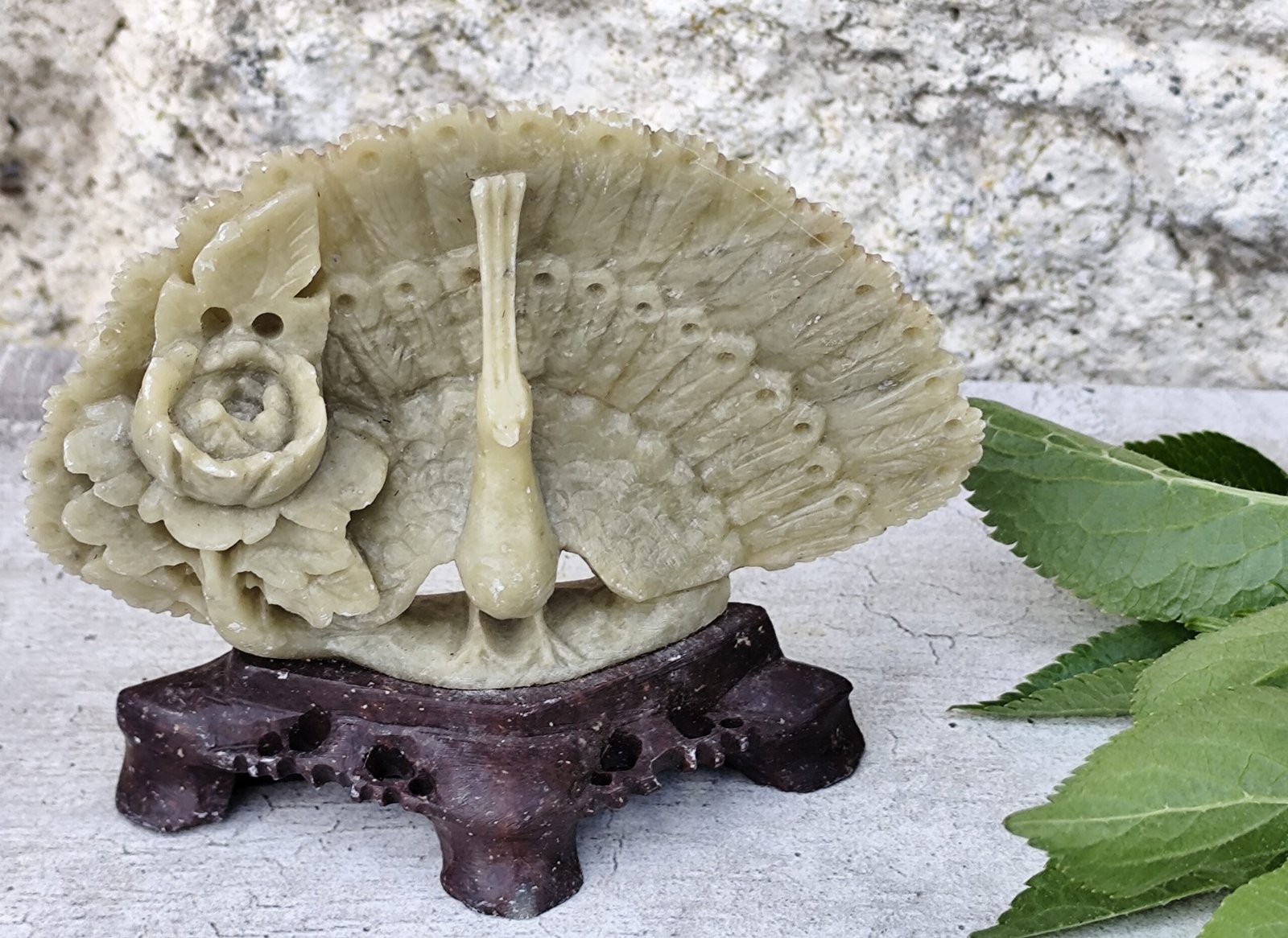 Statue paon en stéatite sculptée – artisanat d’Asie.