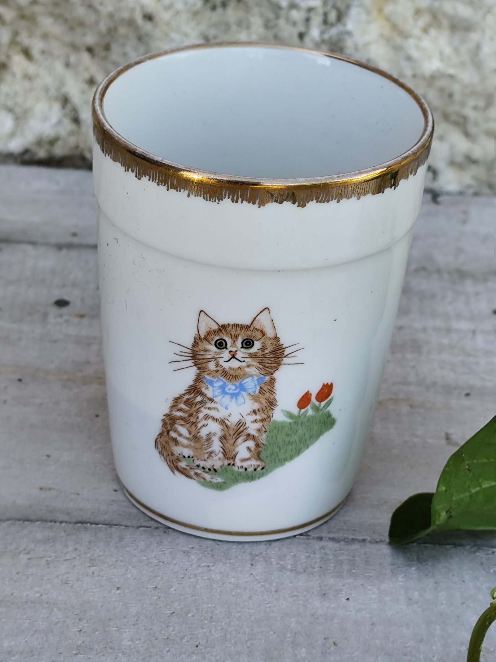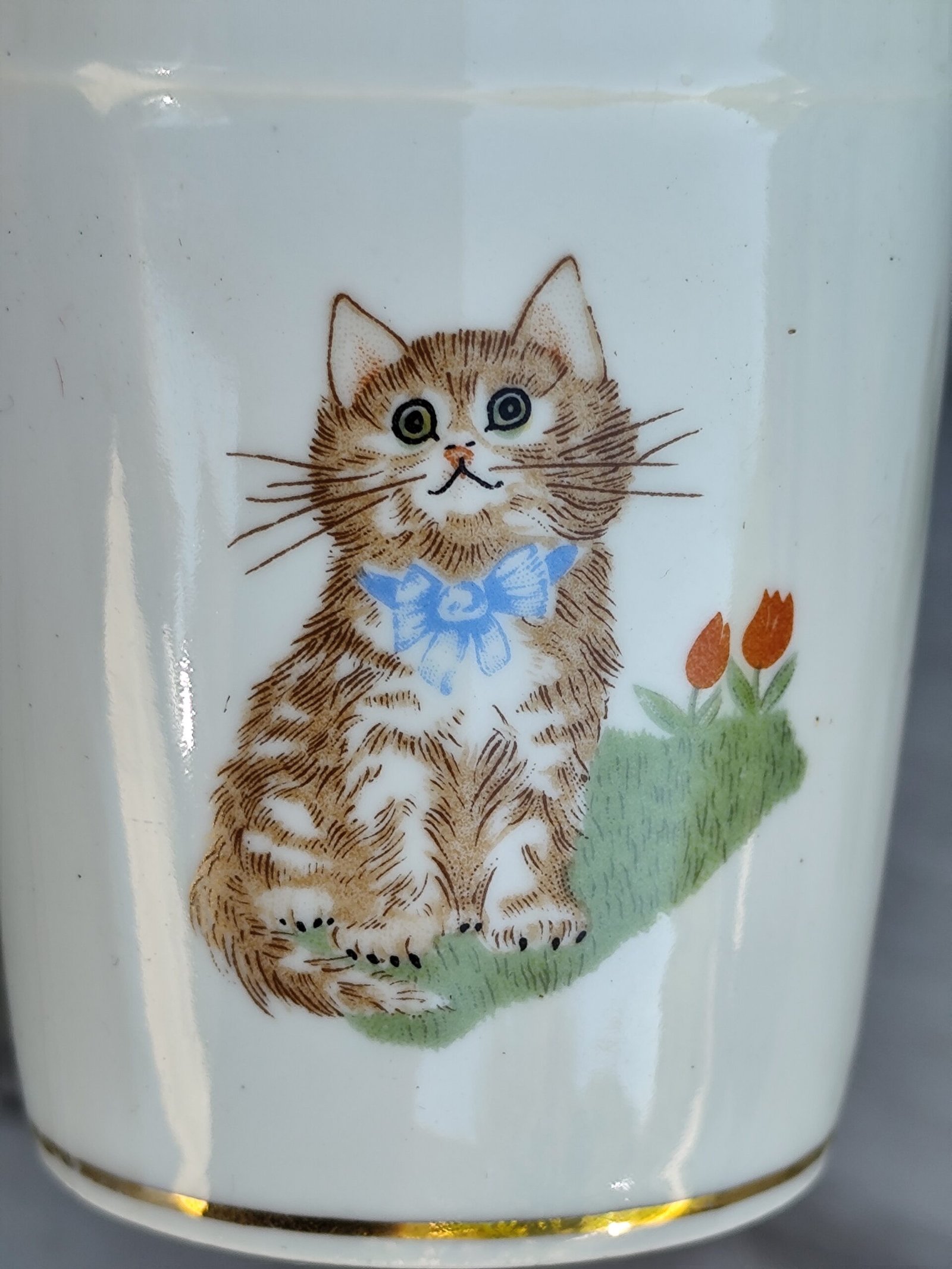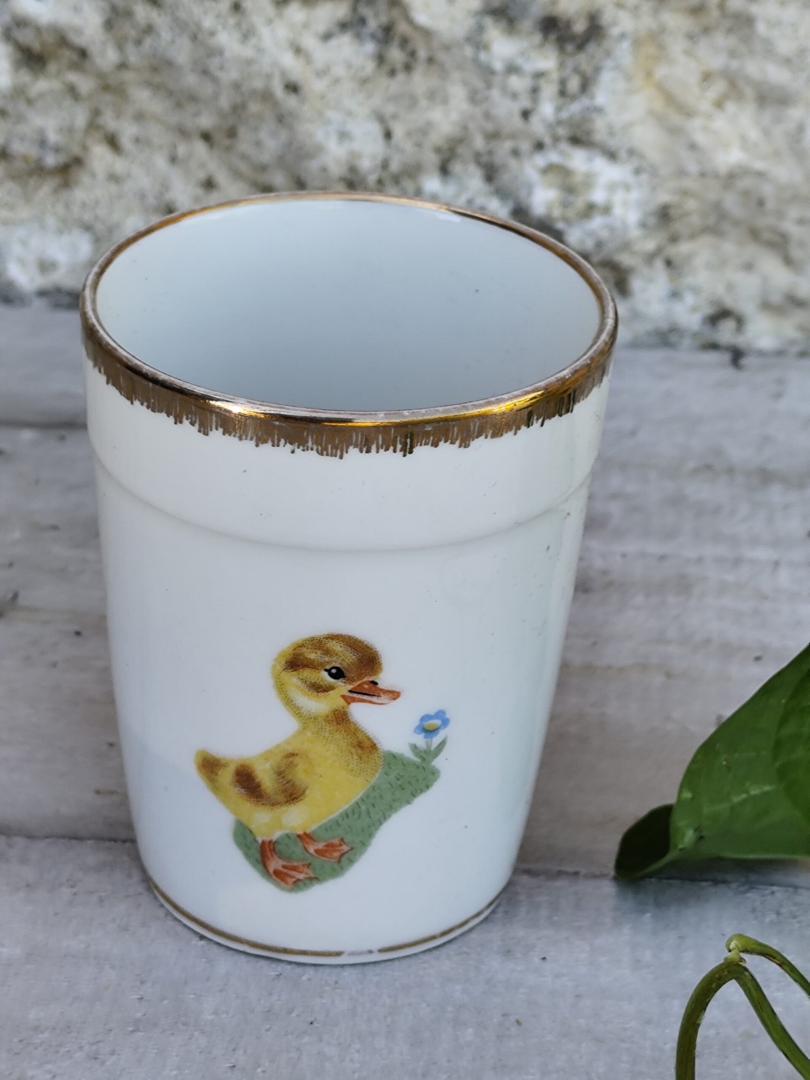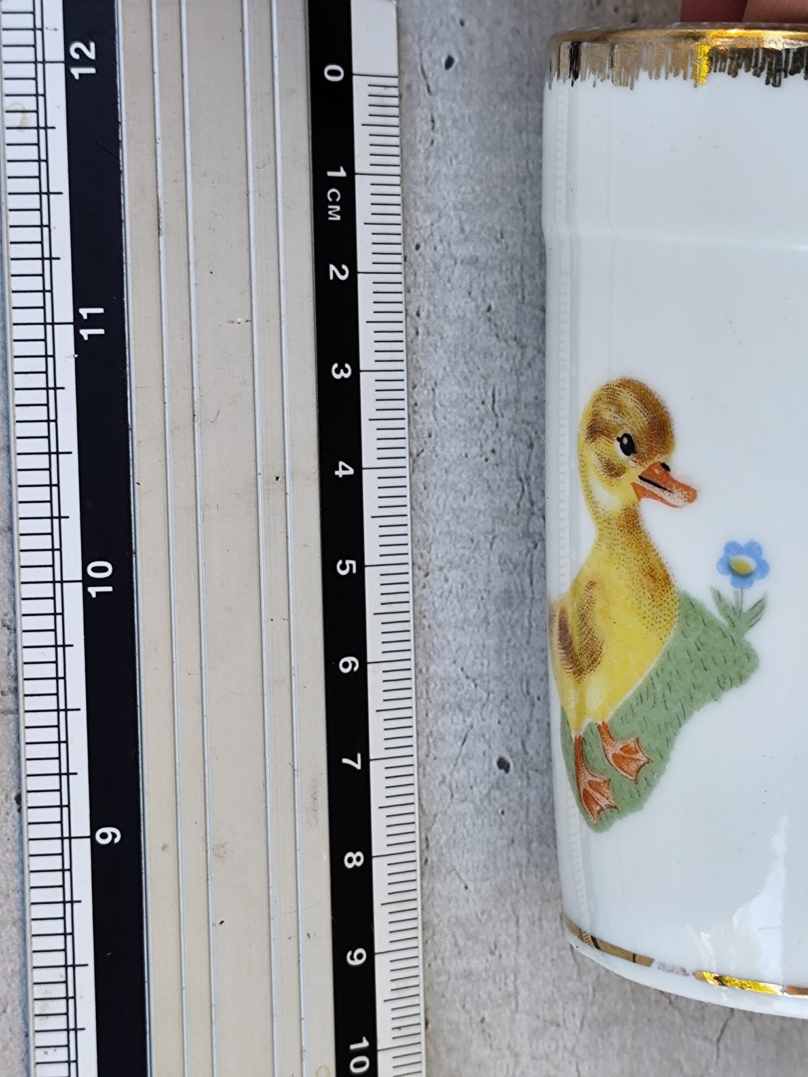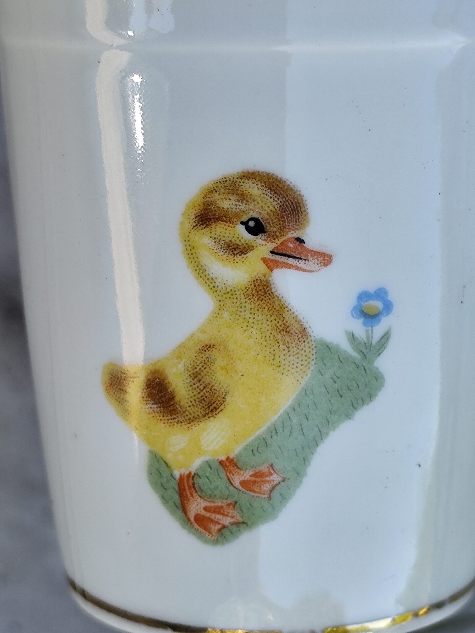 Chaque illustration – chaton curieux, petit chien sage, caneton lumineux – est peinte avec cette tendresse propre aux ateliers français de P. Dussault, où la porcelaine devient un fragment de poésie quotidienne.