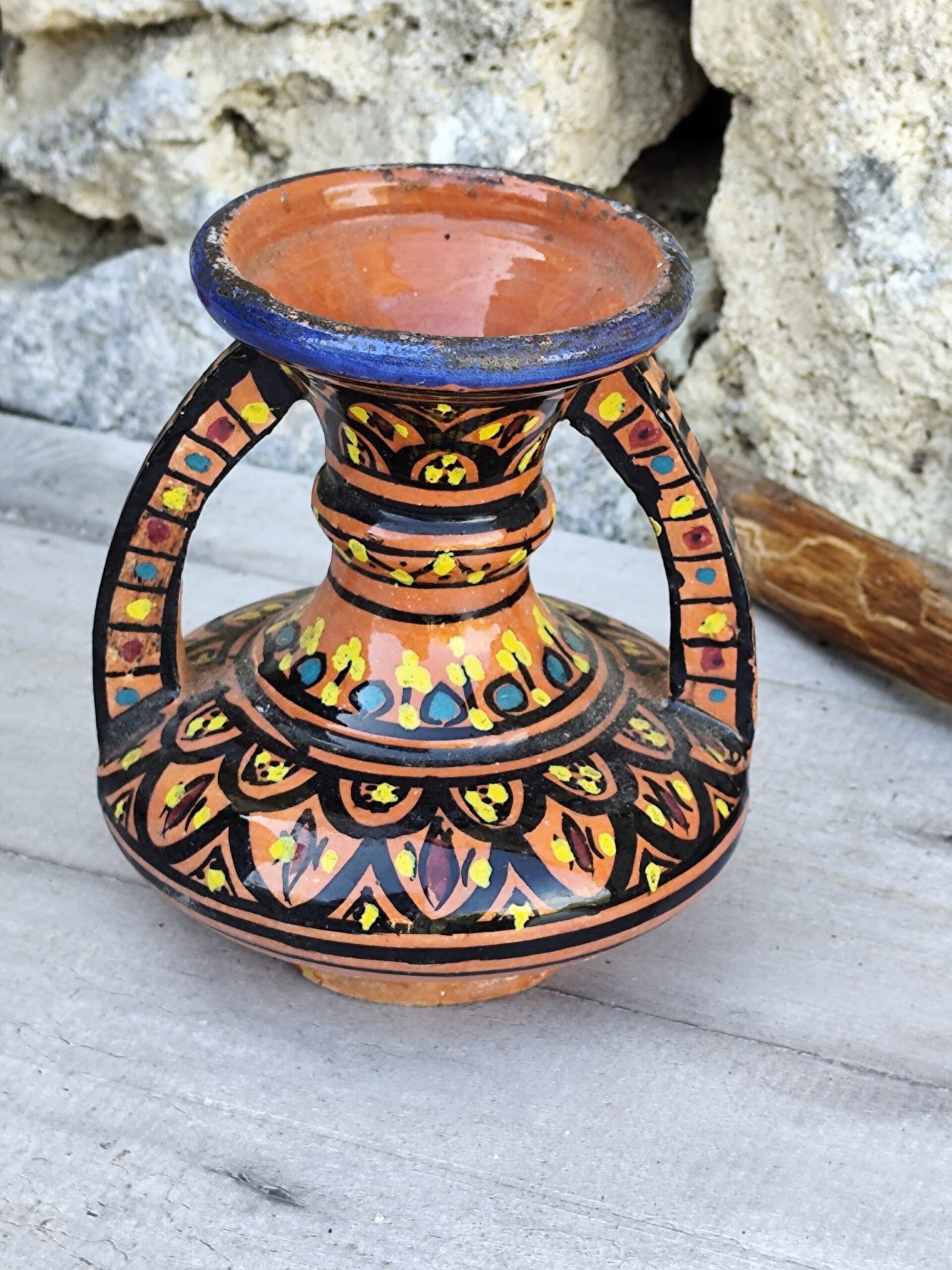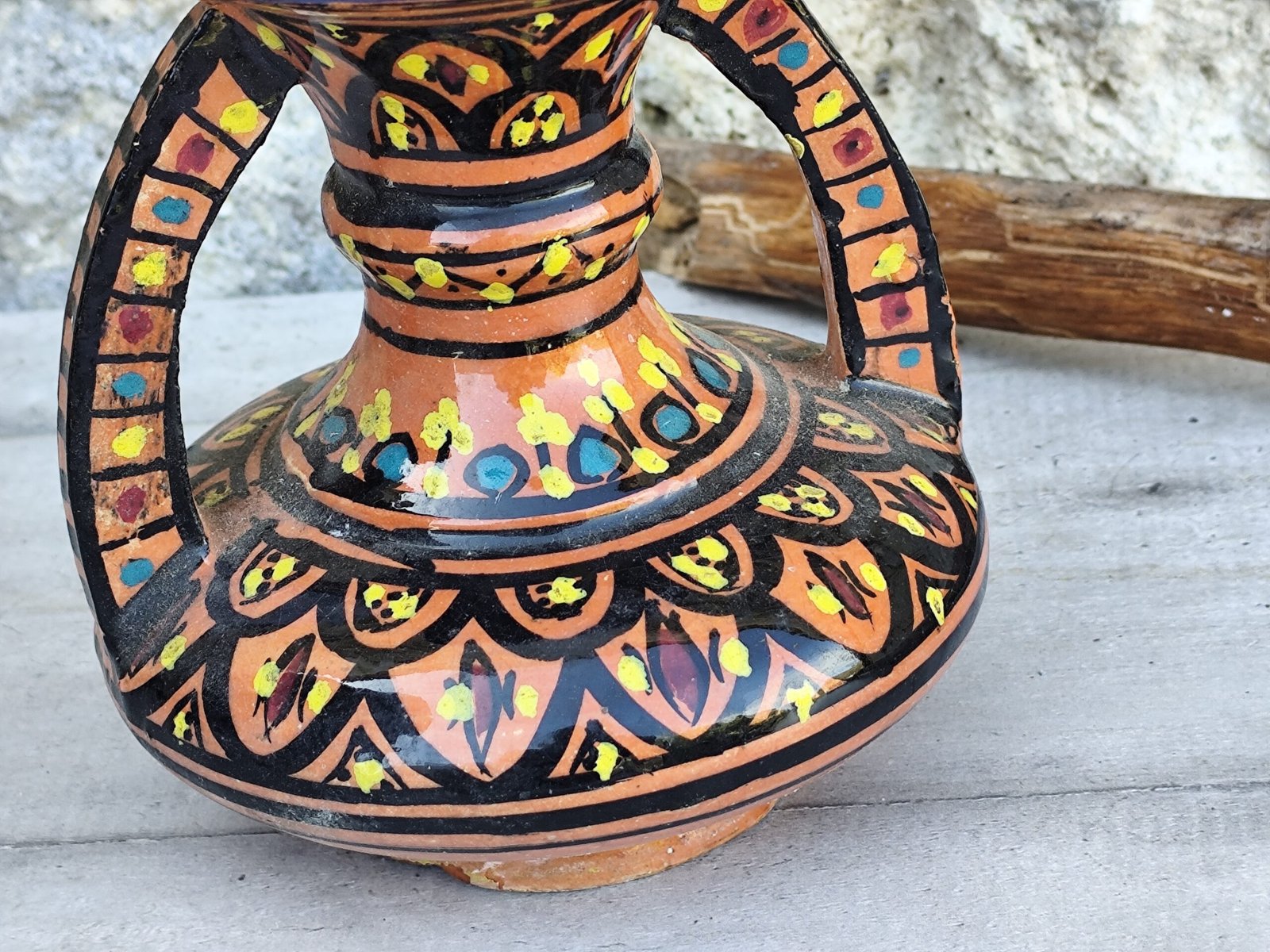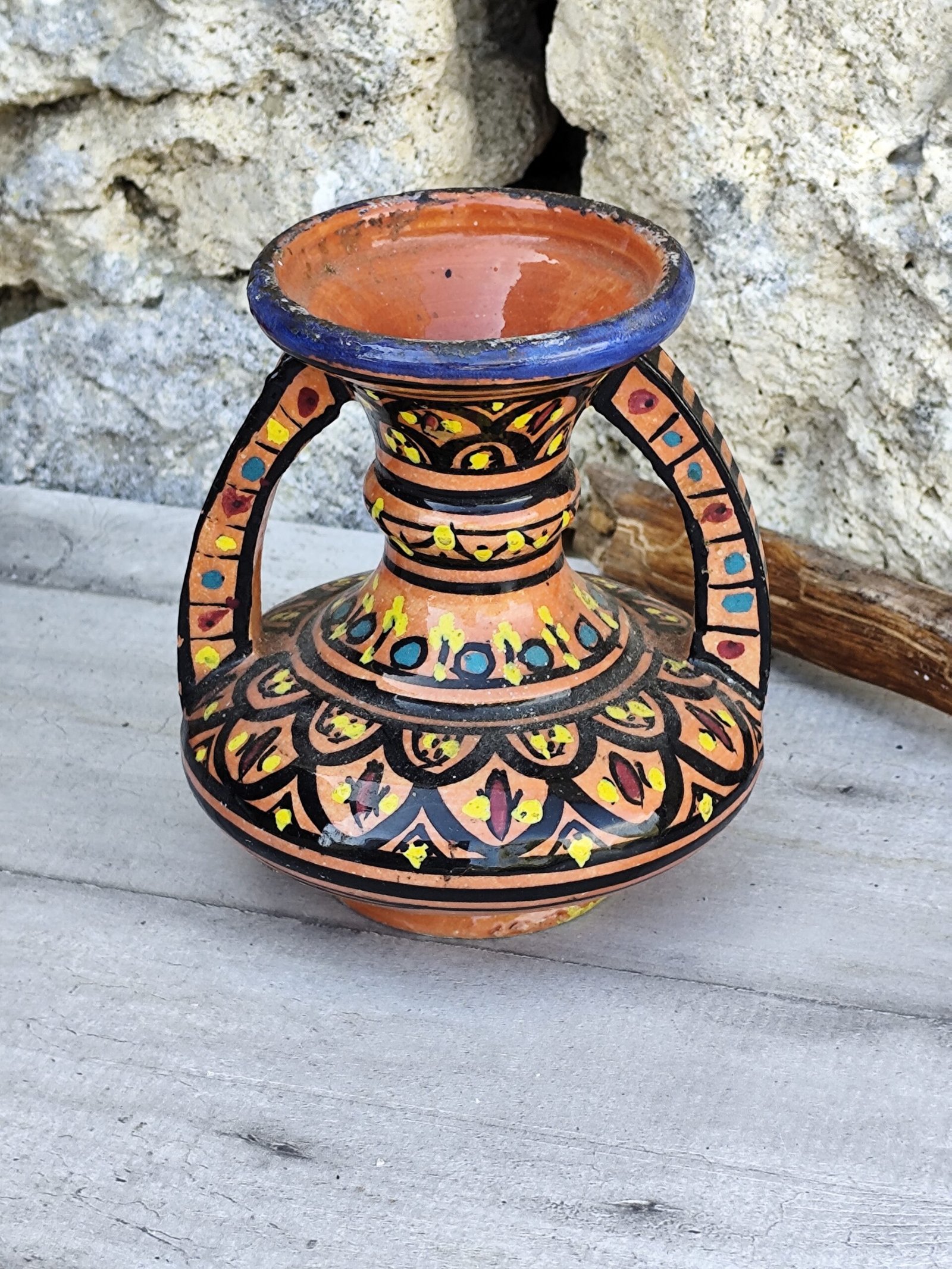 Ce vase en céramique, façonné puis peint à la main, porte les couleurs chaudes des médinas : ocres, noirs profonds, touches de bleu et de rouge qui racontent les motifs ancestraux du Maghreb.