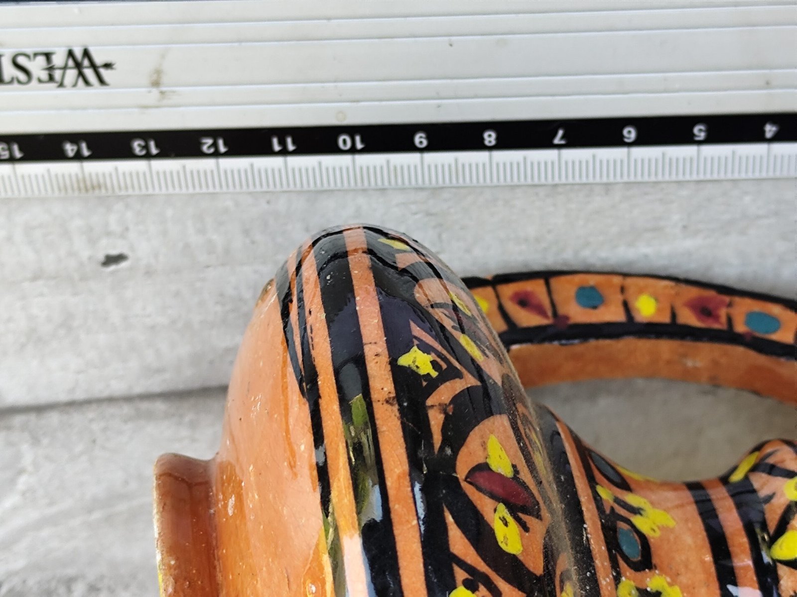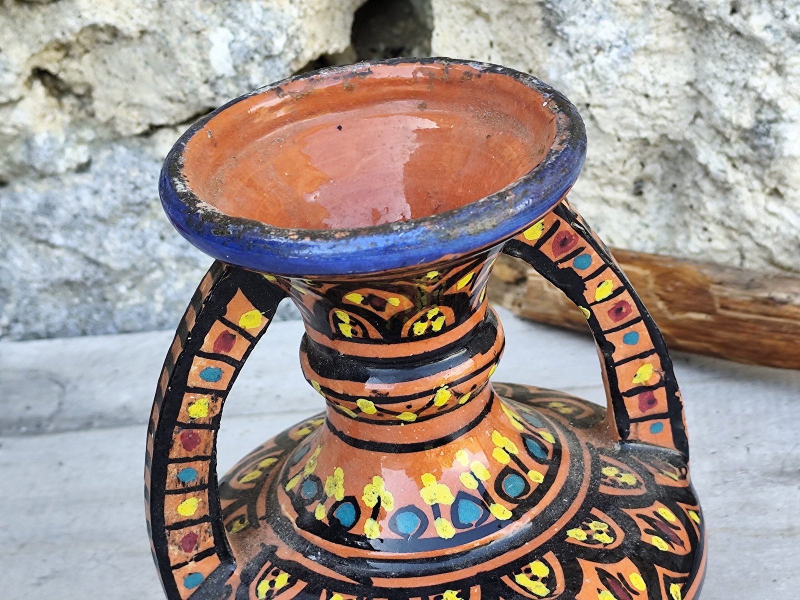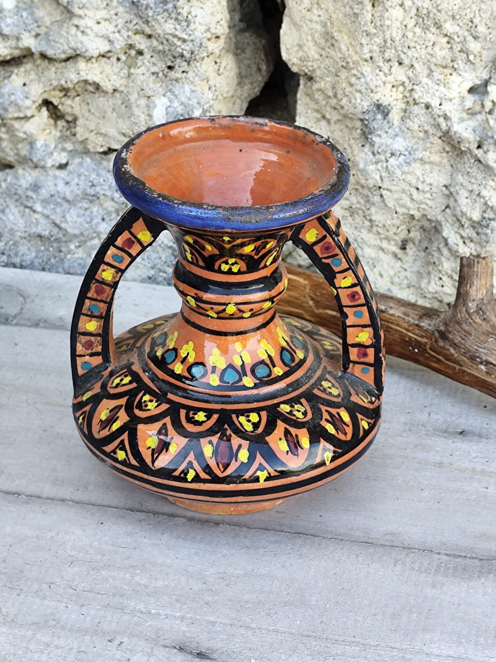 Ce vase en céramique, façonné puis peint à la main, porte les couleurs chaudes des médinas : ocres, noirs profonds, touches de bleu et de rouge qui racontent les motifs ancestraux du Maghreb.